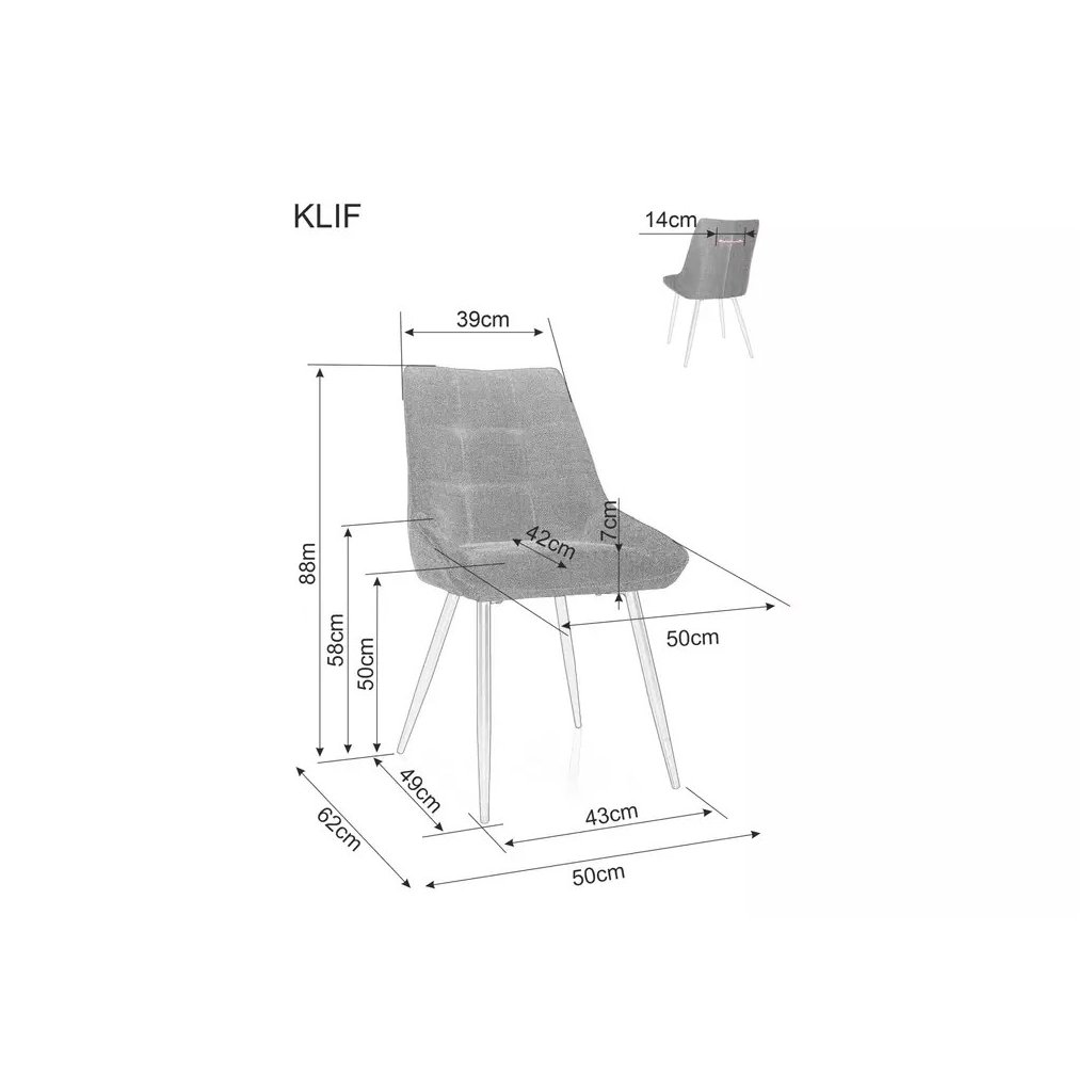 A luxus és stílusos KLIF BJORN étkezőszék jellegzetes és modern varrással ideális kiegészítője otthonának vagy lakásának. A szék kiváló minőségű matt fekete fém lábakkal rendelkezik, amelyek szilárd tartást és gyönyörű megjelenést biztosítanak a belső térnek. A szék esztétikus, de a kiváló minőségű ülésnek köszönhetően kényelmes is .
