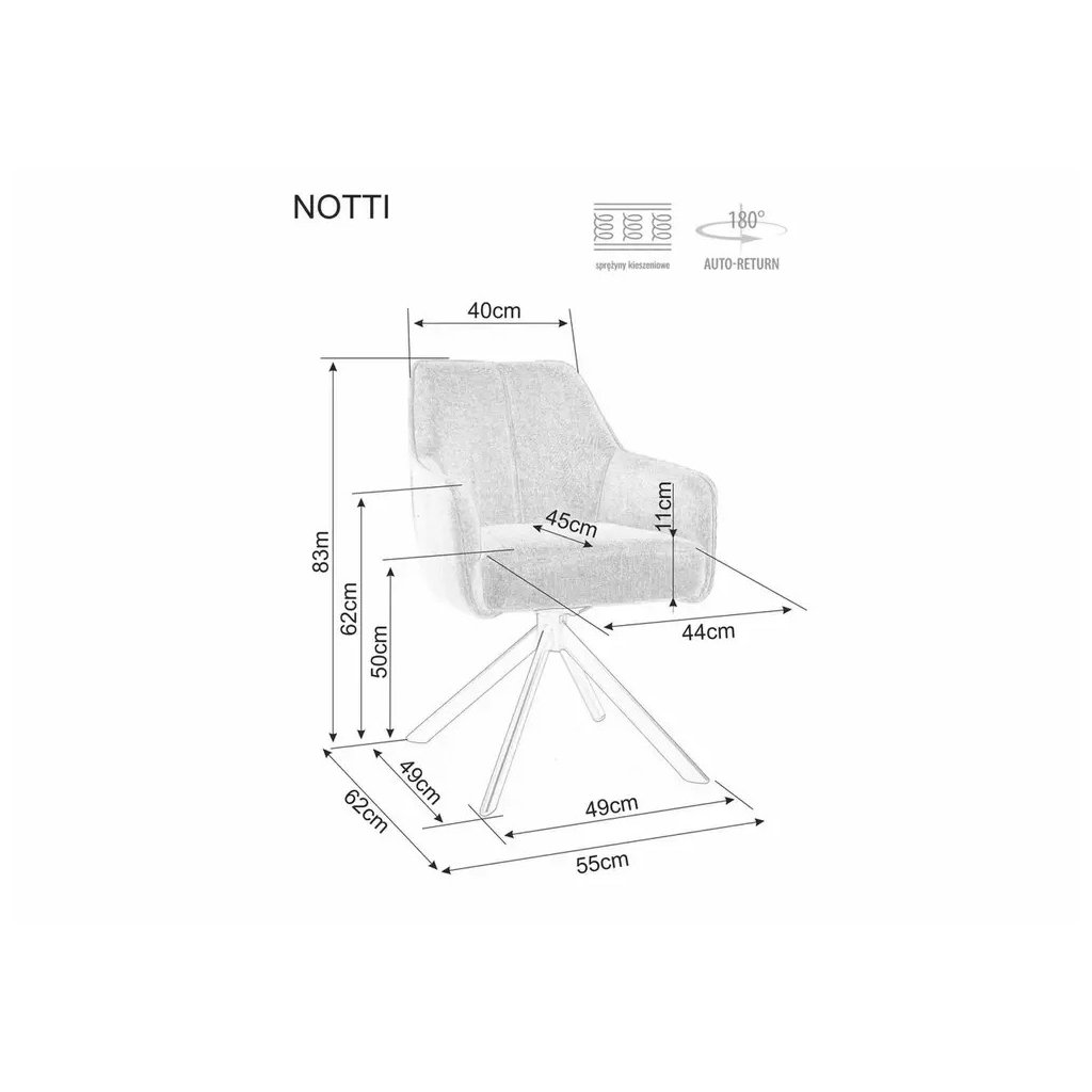 Szüksége van egy csipetnyi luxusra, egyediségre és tökéletességre az étkezőjében? Akkor a NOTTI BREGO étkezőszék a megfelelő választás az Ön számára. A szék időtlen dizájnt és vonzó megjelenést is kínál. A praktikus kialakítás biztosítja a szék 180°-os elforgatásának lehetőségét , automatikus visszahúzó mechanizmussal. Az ülés zsebrugóval van felszerelve.