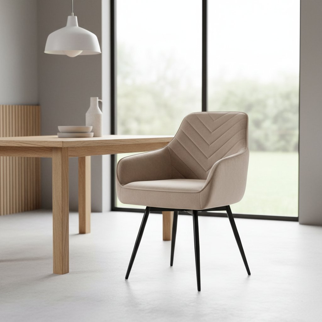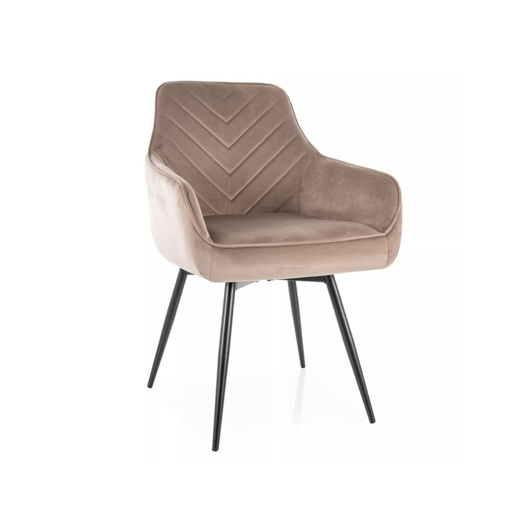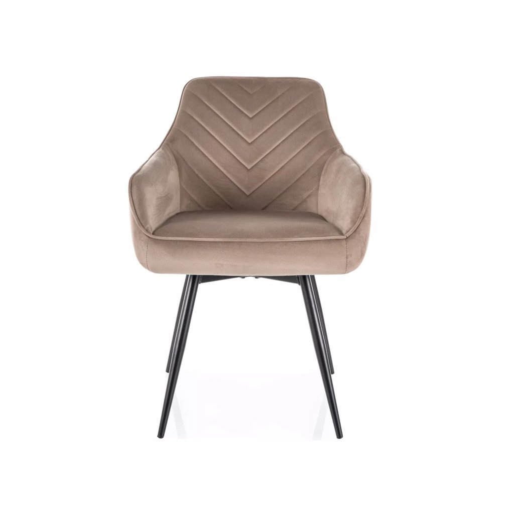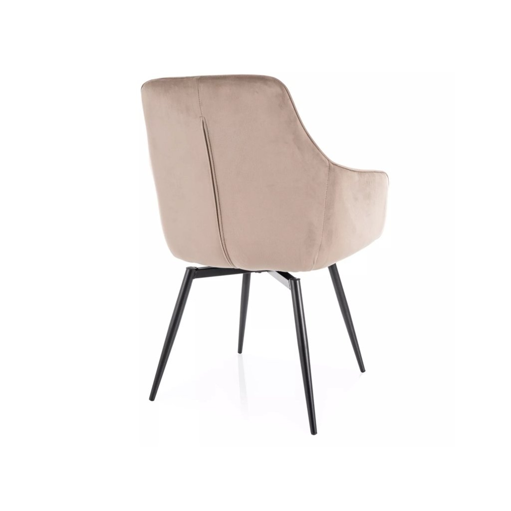 A nagyszerű SERVIO VELVET étkezőszék eleganciát visz étkezőjébe vagy irodájába. A steppelt háttámlának és a kényelmes karfáknak köszönhetően garantáltan tökéletes ülőhelyet és ellazulást biztosít. Az ülés rendkívül kényelmes a zsákrugóknak köszönhetően. További nagy előnye az automatikus visszatérési funkció, amely egy 180 fokban elforgatható ülést biztosít, amely visszatér az eredeti helyzetébe. A szék lábai fémből készültek, elegáns fekete színben. Tökéletesen illeszkedik bármilyen modern enteriőrbe .