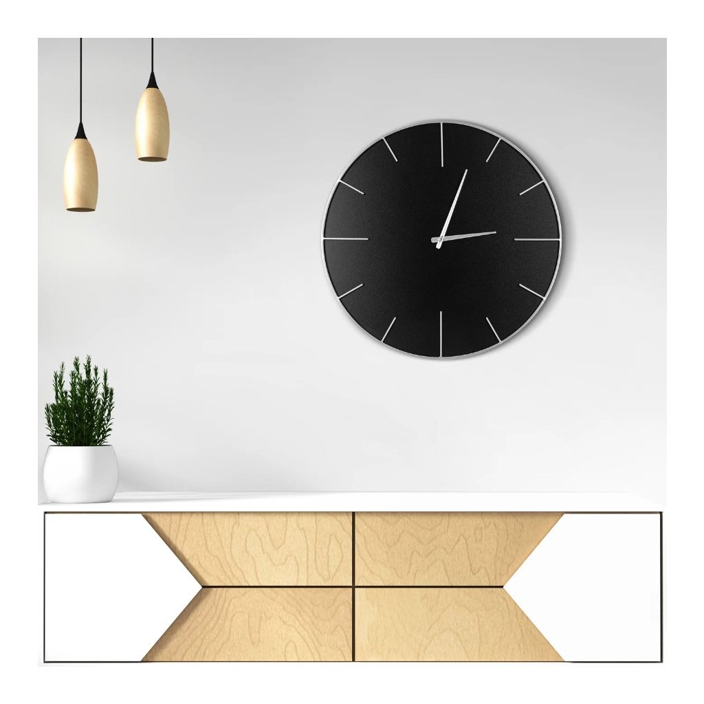 A fekete színű, ezüst részletekkel díszített dizájner órák bármely belső tér vonzerejét növelik. A nagy, 60 cm átmérőjű számlap feltűnő dekoráció lesz, amely nemcsak lakásokba, hanem irodákba, ügyvédi irodákba vagy más irodahelyiségekbe is alkalmas. Ha ezt a terméket választja, biztos lehet benne, hogy egyedi és praktikus dekorációt kap belső terébe. Minimalista dizájnjával az óra modern és retro stílusokhoz egyaránt illeszkedik. Tökéletesen illeszkednek az elbűvölő, ipari vagy modernista elrendezésekbe is.