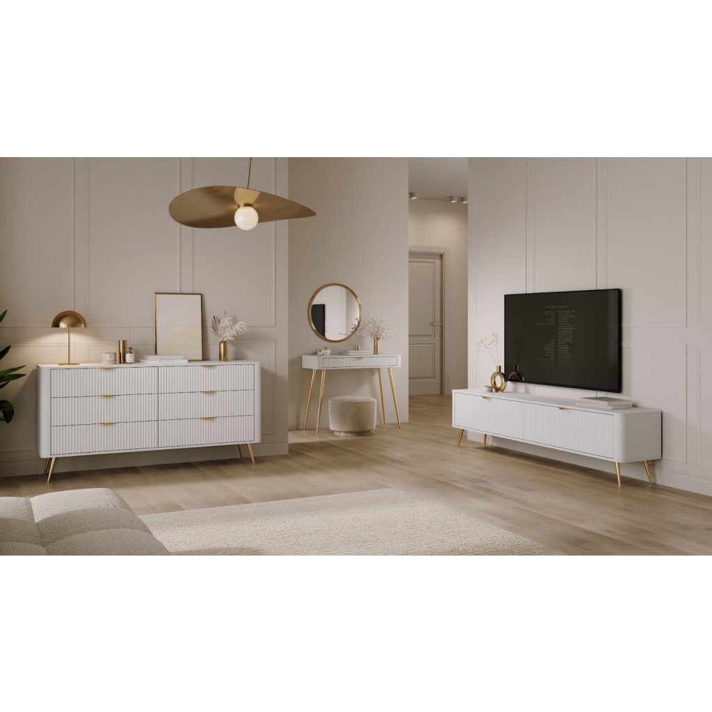 A LINA fésülködőasztal harmonikus hangulatot teremt otthonában finom, mégis stílusos és elegáns megjelenésével . Az eredeti fehér szín béke és egyensúly érzetét kelti a belső térben, amit tökéletesen kiegészítenek az arany fogantyúk és lábak, amelyek otthonos és kifinomult hellyé varázsolják a teret. A lekerekített élek és a barázdált asztallapok modern megjelenést és eredetiséget kölcsönöznek. A fésülködőasztal egy tágas fiókkal rendelkezik.
