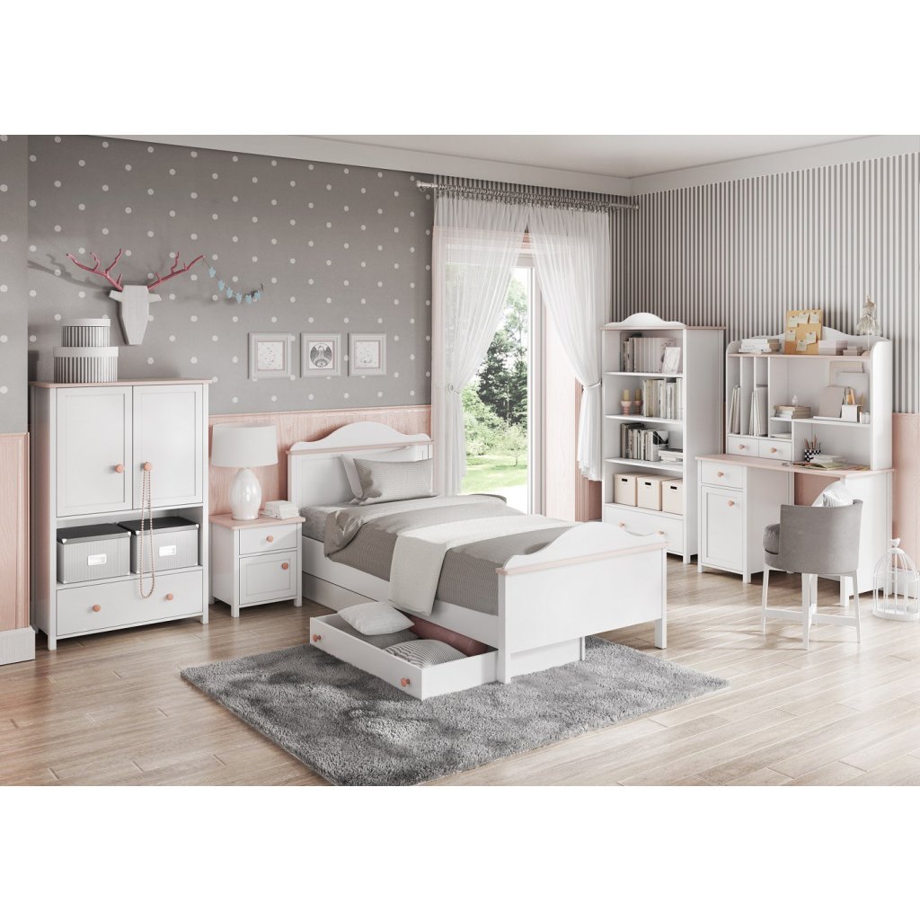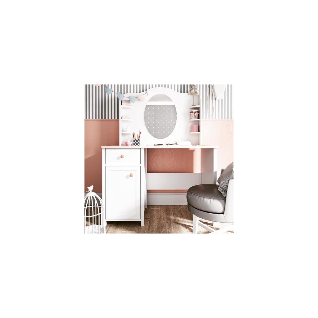 Az egyedi LUNYS NL-06 fésülködőasztal különösen alkalmas gyerekszobák berendezésére, melyet különösen a kislányok fognak élvezni. A fésülködőasztal fehér és rózsaszín kombinációjában készült, ami végső soron nagyon kellemes kontrasztot teremt. A LUNYS gyermekbútor kollekció kiváló minőségű anyagokból készült, így ellenáll a víznek és a mechanikai sérüléseknek. A fésülködőasztal tükörrel és oldalsó polcokkal rendelkezik. A fésülködőasztalhoz illik a LUNYS LN-03 íróasztal vagy a LUNYS LN-05 fiókos komód . A LUNYS kollekciót úgy tervezték, hogy a praktikumot a gyönyörű és modern dizájnnal ötvözze.