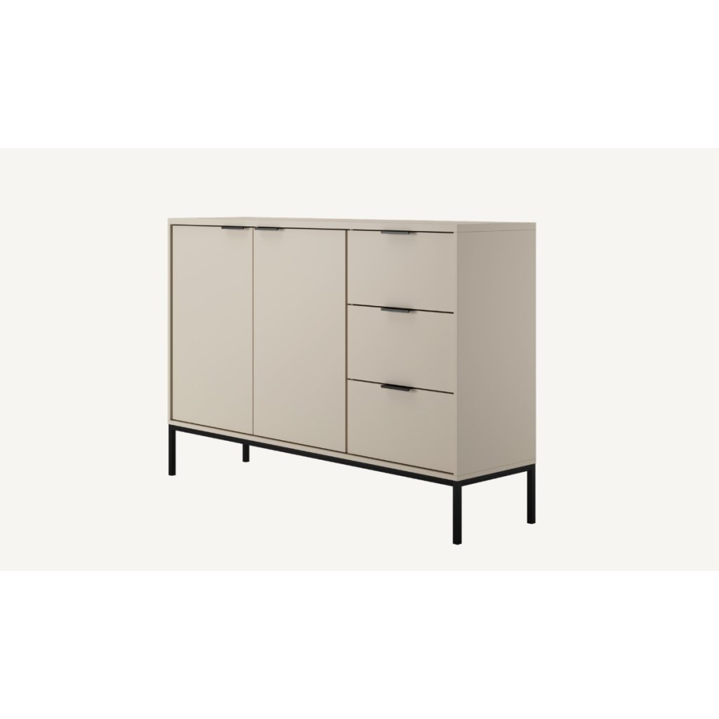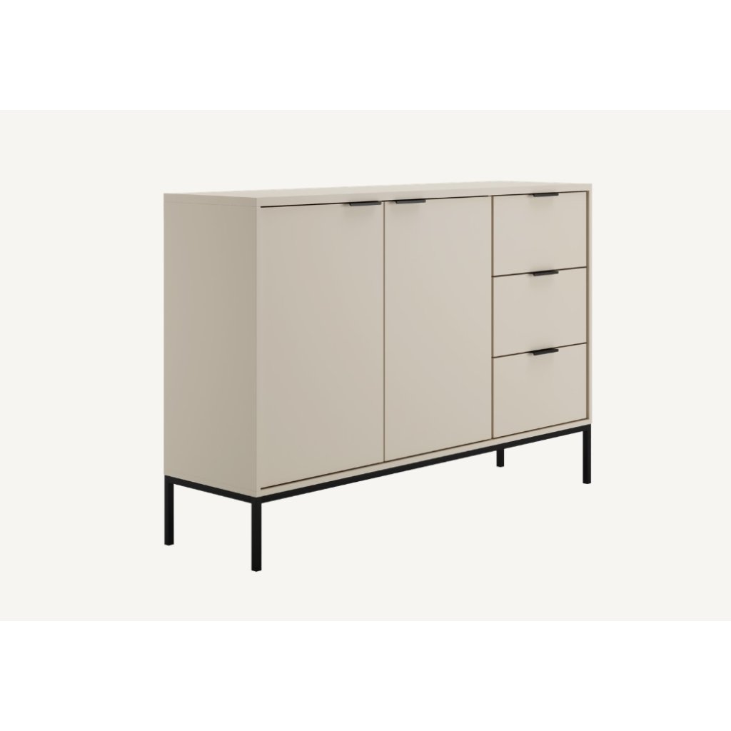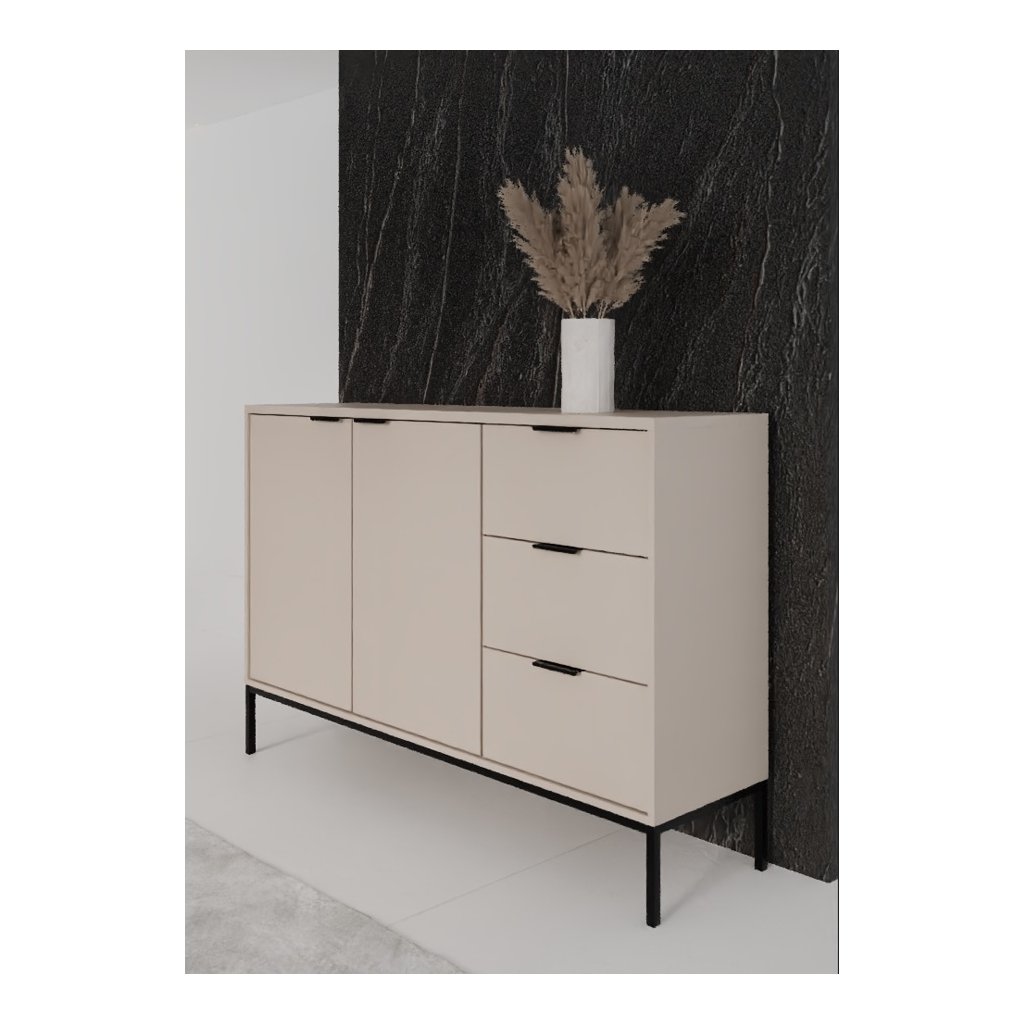 Tegyen egy csipetnyi eleganciát otthonába az AUSTIN fiókos komóddal, modern kasmír felülettel és fekete fogantyúk kombinációjával . Ez a stílusos darab a letisztult minimalista dizájnt ötvözi a magas szintű funkcionalitással, így ideális kiegészítője lehet bármely otthonnak. A fiókos komód három tágas fiókkal és két zárható, állítható polcokkal ellátott szekrénykével rendelkezik, amelyek rengeteg helyet biztosítanak ruhák, kiegészítők vagy egyéb szükséges dolgok számára. A fiókok klasszikus sínekkel vannak felszerelve, lágyan záródó rendszer nélkül.