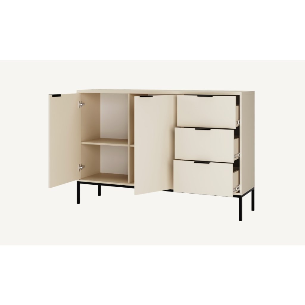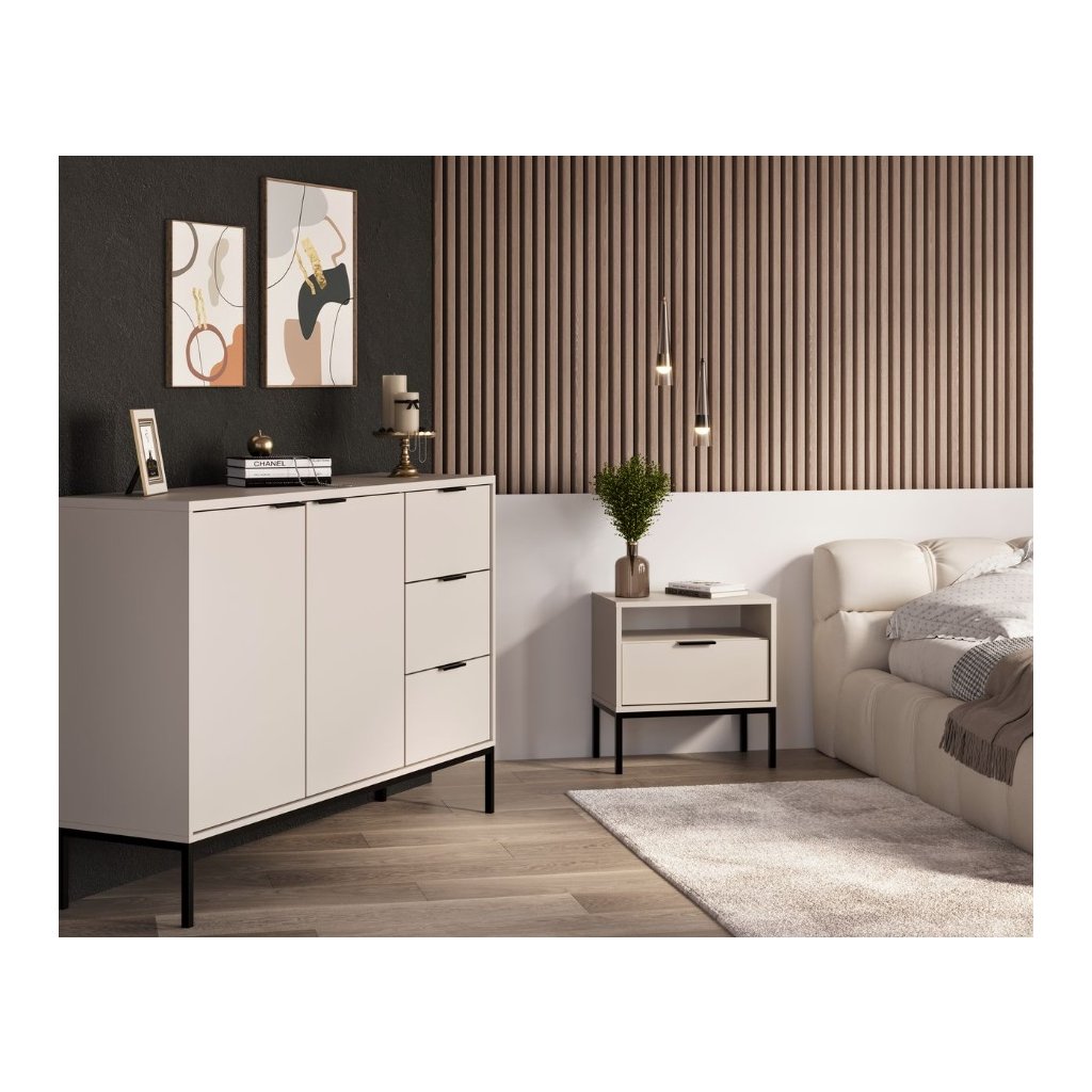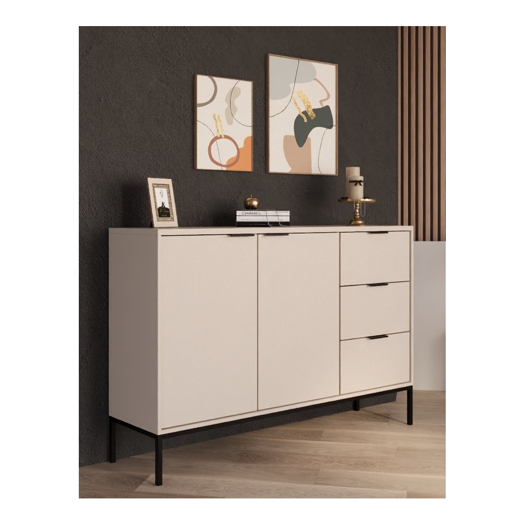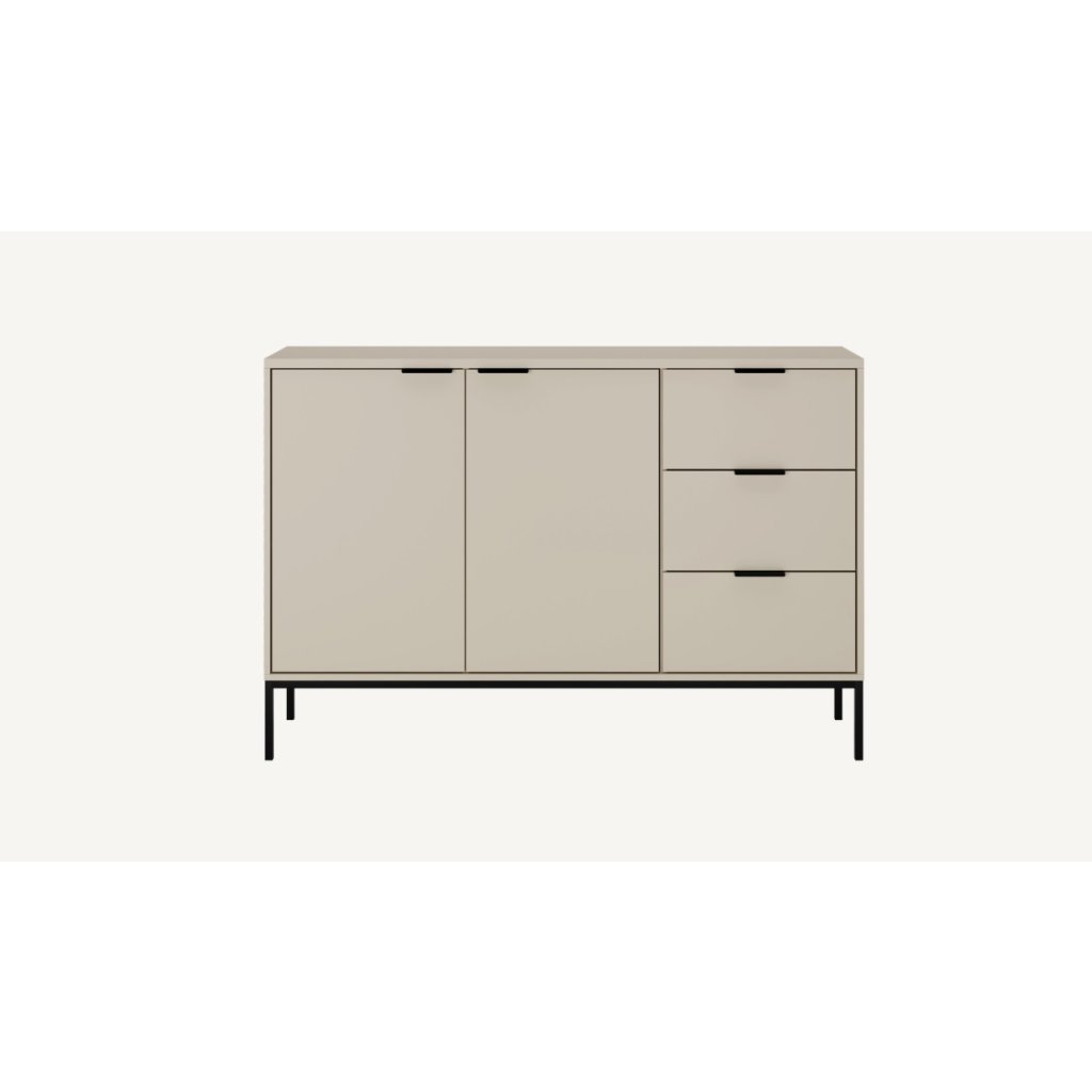 Tegyen egy csipetnyi eleganciát otthonába az AUSTIN fiókos komóddal, modern kasmír felülettel és fekete fogantyúk kombinációjával . Ez a stílusos darab a letisztult minimalista dizájnt ötvözi a magas szintű funkcionalitással, így ideális kiegészítője lehet bármely otthonnak. A fiókos komód három tágas fiókkal és két zárható, állítható polcokkal ellátott szekrénykével rendelkezik, amelyek rengeteg helyet biztosítanak ruhák, kiegészítők vagy egyéb szükséges dolgok számára. A fiókok klasszikus sínekkel vannak felszerelve, lágyan záródó rendszer nélkül.