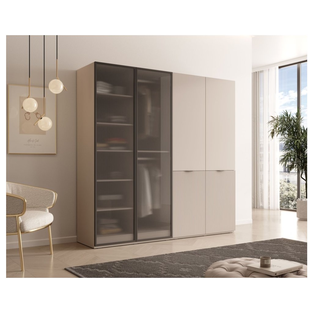 A modern, moduláris kialakítású FLEXON garnitúra lehetővé teszi a tárolóhely testreszabását az igényei és a szoba méretei szerint. Kasmír színben, elegánsan mart ajtókkal és üvegezett, rovátkolt ajtókkal bármilyen belső térbe illik. A praktikus fekete alumínium fogantyúk hangsúlyozzák a modern megjelenést. A gardrób belső elrendezése polcokat és akasztórudakat kínál, amelyek maximális átláthatóságot és helyet biztosítanak a ruhák felakasztására.