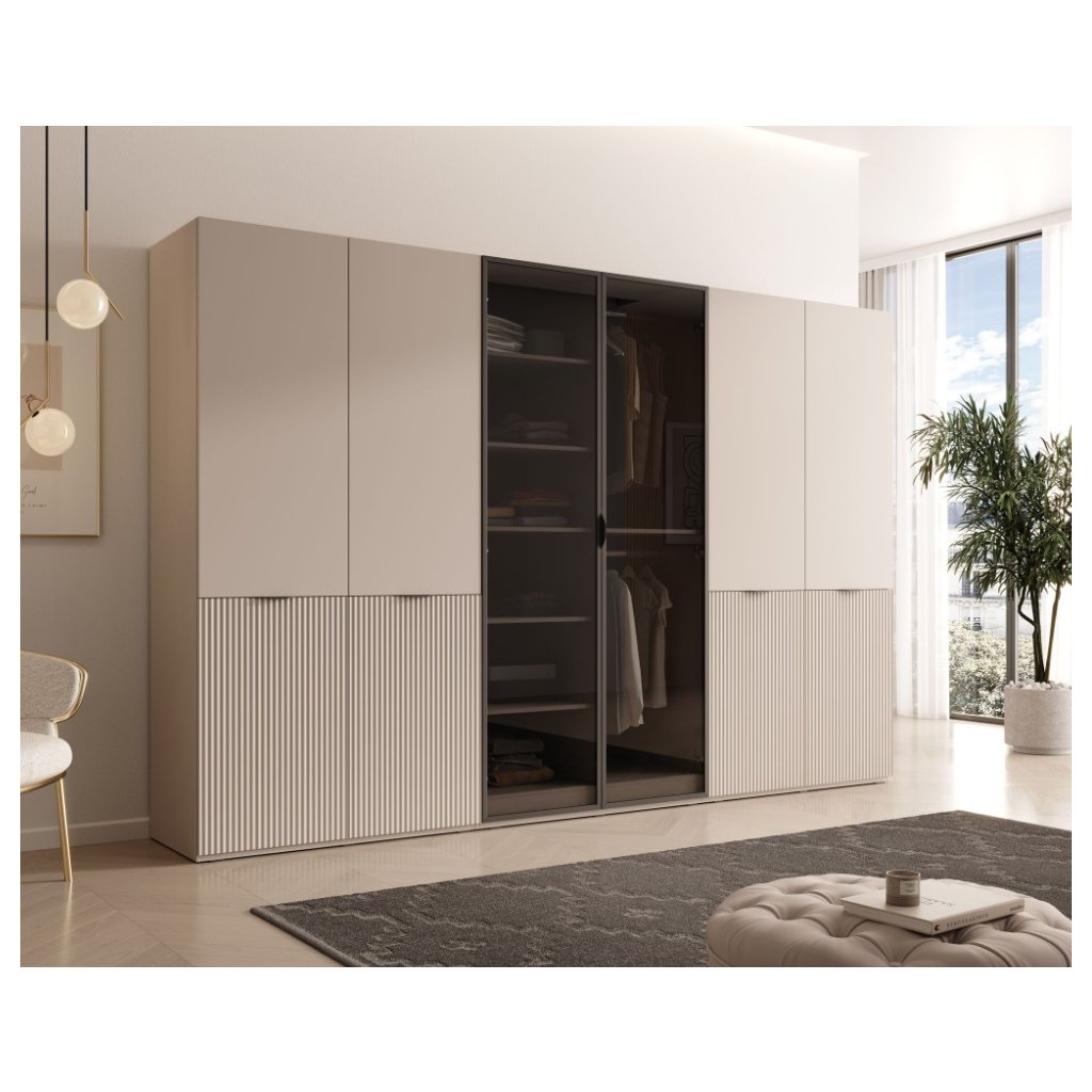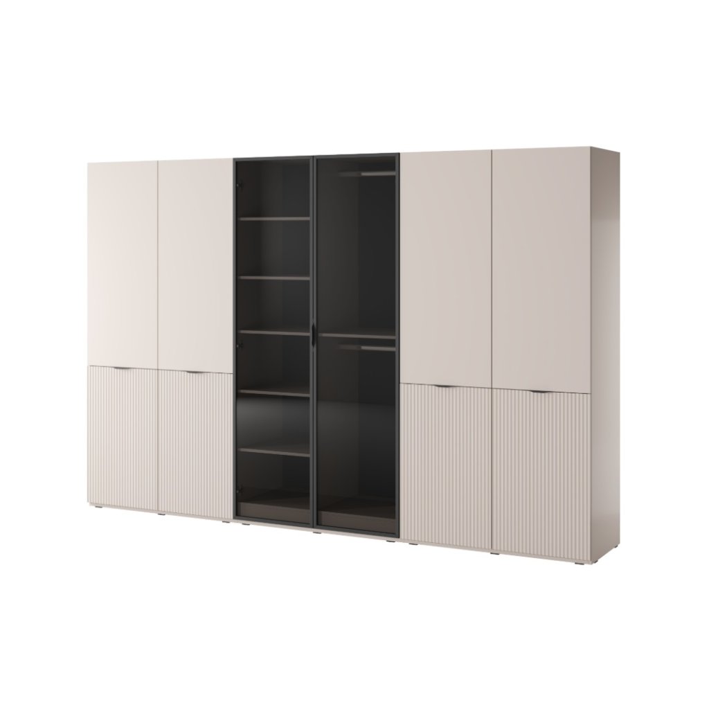 A modern, moduláris kialakítású FLEXON III gardróbszekrény lehetővé teszi a tárolóhely testreszabását az igényei és a szoba méretei szerint. Kasmír színben, elegánsan mart ajtókkal és üvegajtókkal, bármilyen belső térbe illik. A praktikus fekete alumínium fogantyúk hangsúlyozzák a modern megjelenést. A gardrób belső elrendezése polcokat és akasztórudakat kínál, amelyek maximális átláthatóságot és helyet biztosítanak a ruhák felakasztására.