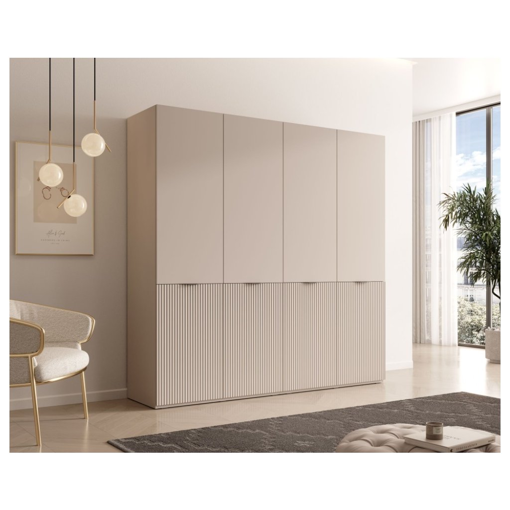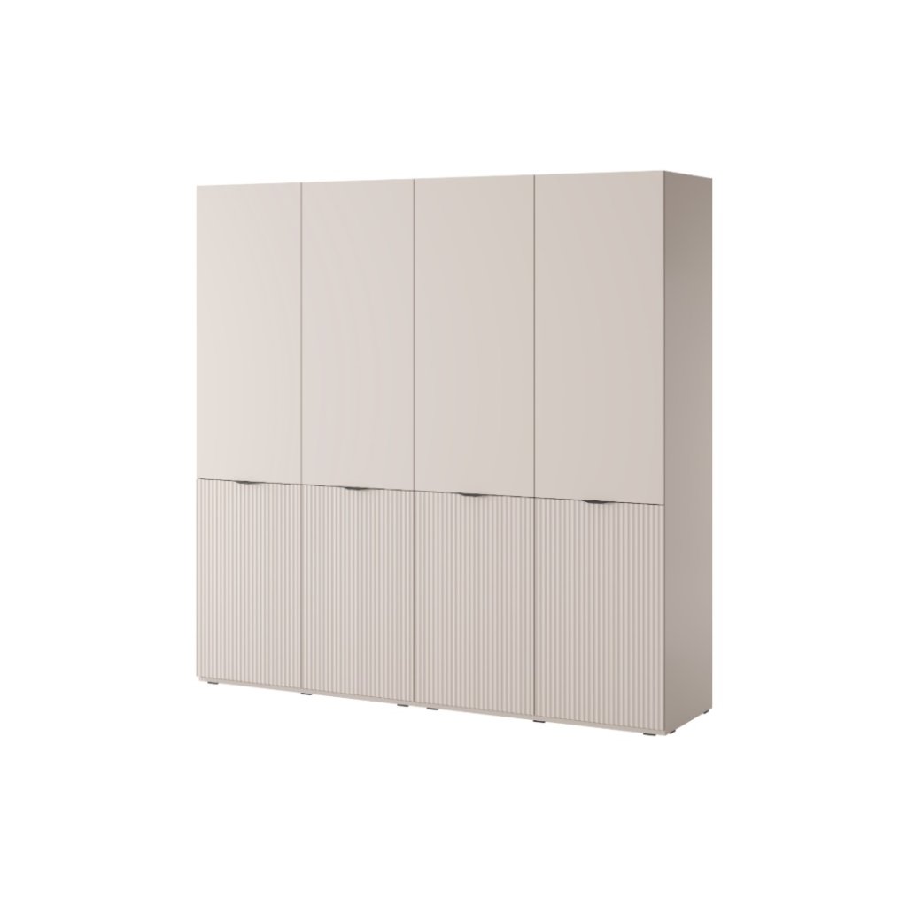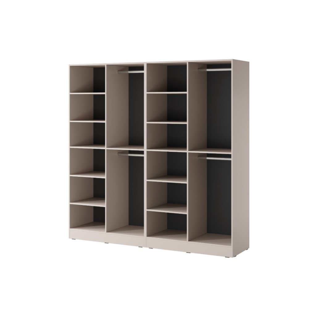 A modern, moduláris kialakítású FLEXON IV gardróbszekrény lehetővé teszi a tárolóhely testreszabását az igényei és a szoba méretei szerint. Kasmír színben, elegánsan mart ajtókkal, bármilyen belső térbe illeszkedik. A praktikus fekete alumínium fogantyúk hangsúlyozzák a modern megjelenést. A gardrób belső elrendezése polcokat és akasztórudakat kínál, amelyek maximális átláthatóságot és helyet biztosítanak a ruhák felakasztására.