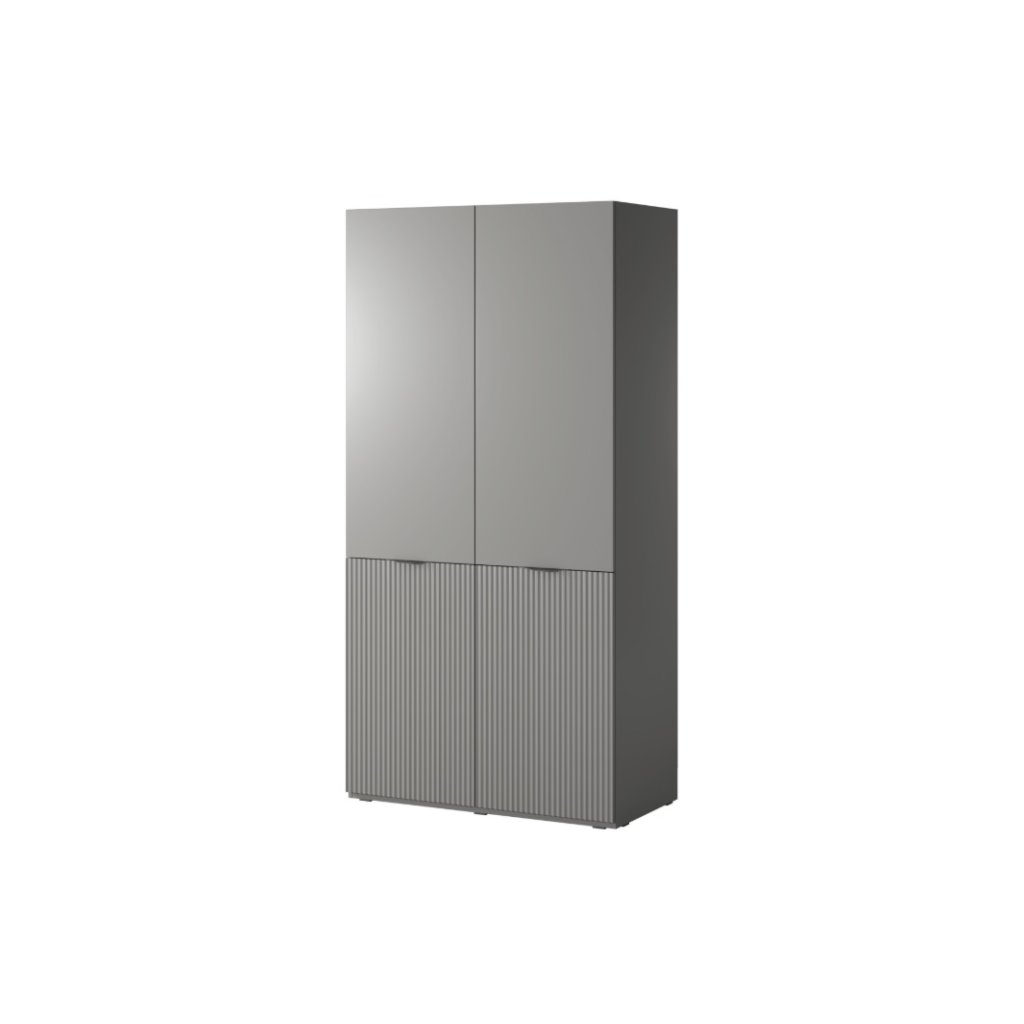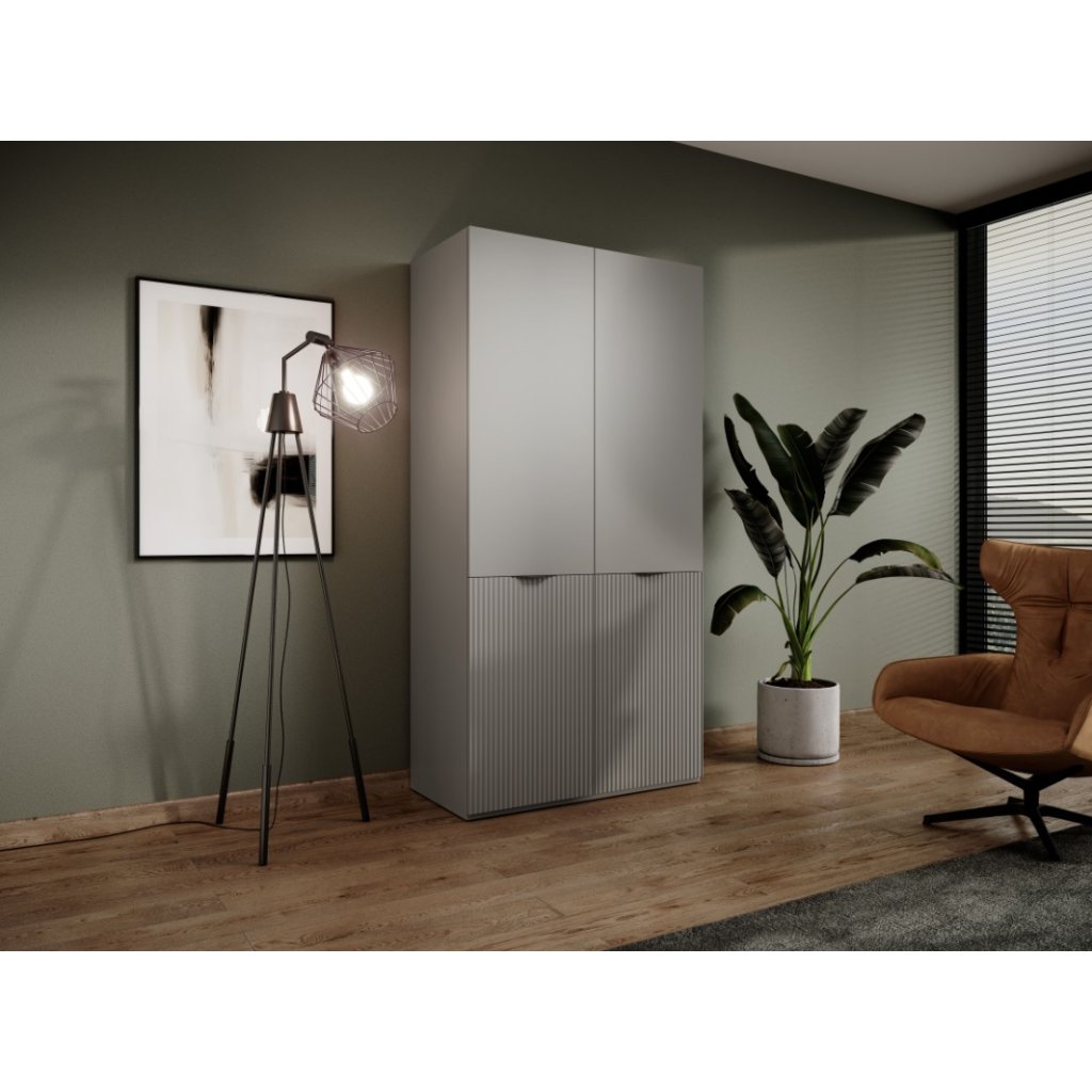 A modern, moduláris kialakítású FLEXON gardrób lehetővé teszi a tárolóhely testreszabását az igényei és a szoba méretei szerint. Szürke színben, elegánsan mart ajtókkal, bármilyen belső térbe illik. A praktikus fekete alumínium fogantyúk hangsúlyozzák a modern megjelenést. A gardrób belső elrendezése polcokat és akasztórudakat kínál, amelyek maximális átláthatóságot és helyet biztosítanak a ruhák felakasztására.