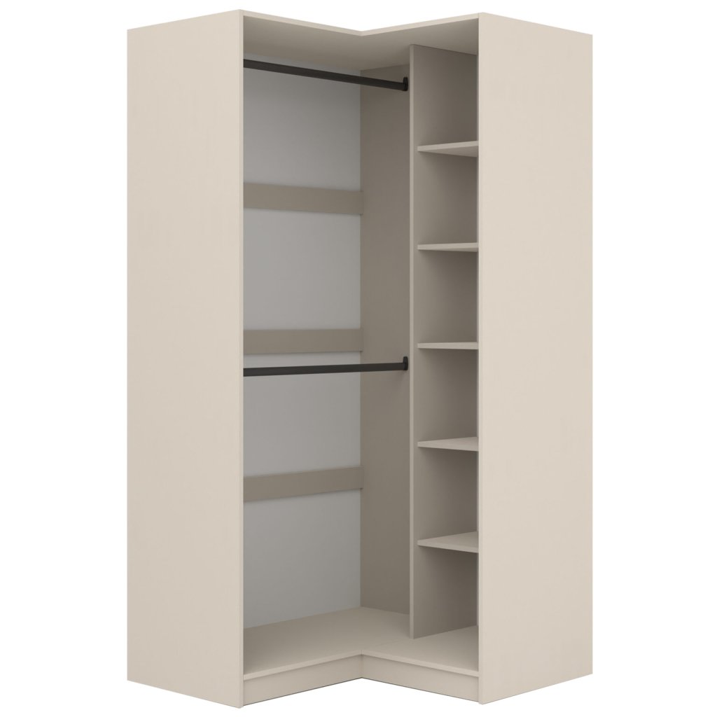 Ez a FOX kollekcióból származó sarokgardrób praktikus megoldást kínál a szoba sarkaiban lévő tér hatékony kihasználására. Elegáns kasmír árnyalatú egyszerű kialakításának köszönhetően letisztult és időtlen megjelenésű. A gardrób 16 mm-es laminált bútorlapból készült, amely stabilitást és hosszú élettartamot biztosít. Ideális kiegészítője egy moduláris szettnek, amelynek köszönhetően a belső elrendezésnek megfelelően funkcionális és komplett gardróbot állíthat össze.