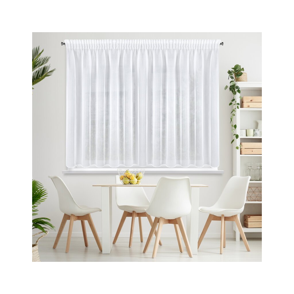 A kész sima fényes függöny szélessége: 350 cm, hossza: 150 cm, színe: fehér, súlya: 50 GSM, összetétele: Anyaga: 100% poliészter