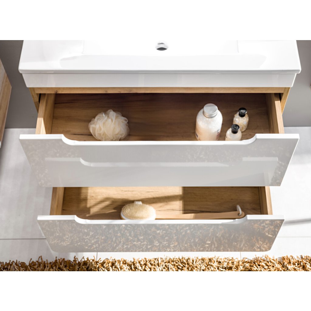 Egy divatos fürdőszobai garnitúrára vágyik, amely néhány év után is időtlennek és modernnek tűnik? Tehát az ARUBA fürdőszoba készlet a megfelelő választás az Ön számára. Tetszetős színkombinációban készül dub craft arany/fehér fényű, ami egyszerűen halhatatlan. A kényelmes és egyszerű napi használat az ajtók és fiókok csendes zárását biztosítja. A bútor mart fogantyúkkal rendelkezik. A bútorokat szétszerelve szállítjuk, és speciális felülettel rendelkeznek, amely ellenáll a nedvességnek a fürdőszobában. A szekrények csendes hozzáféréssel vannak felszerelve.