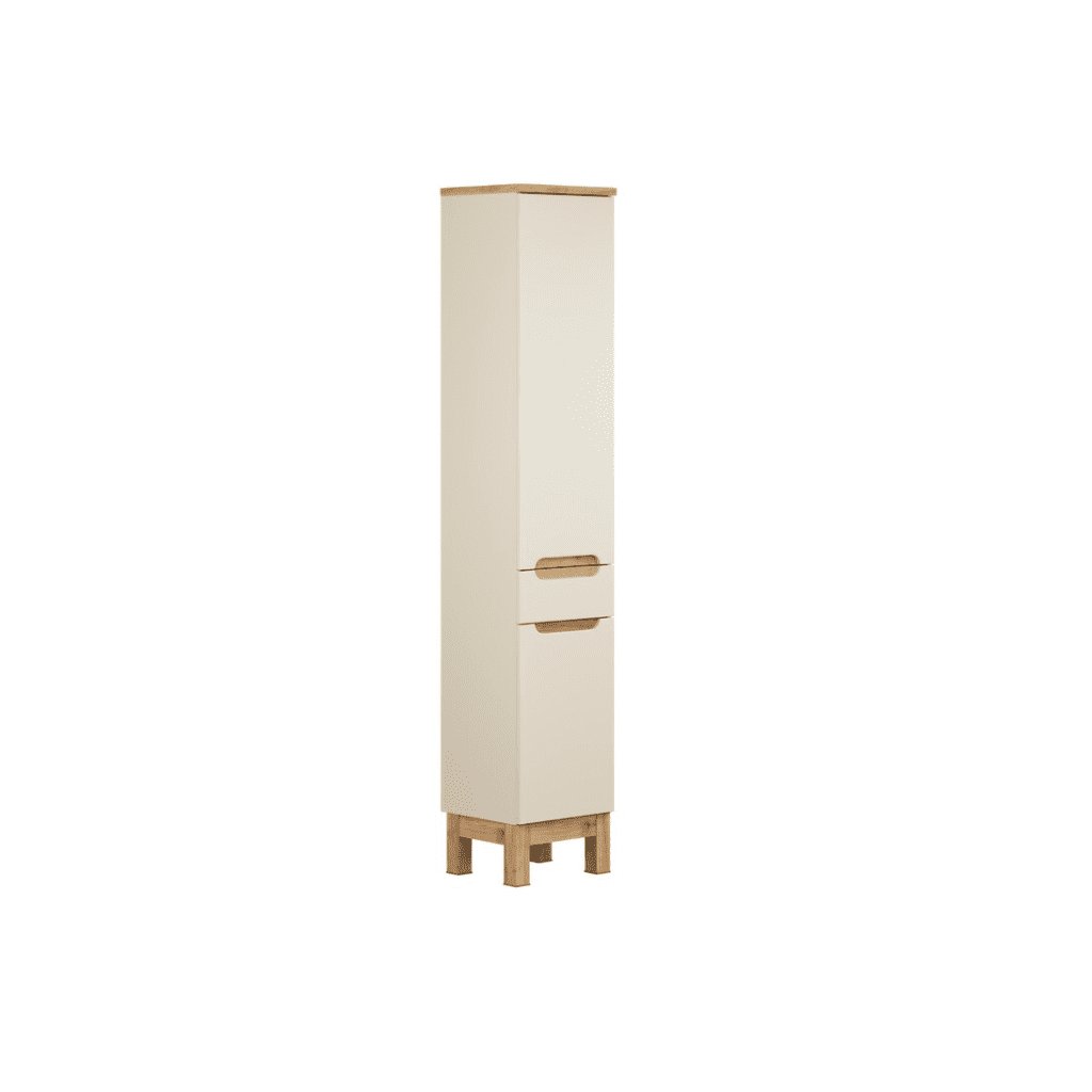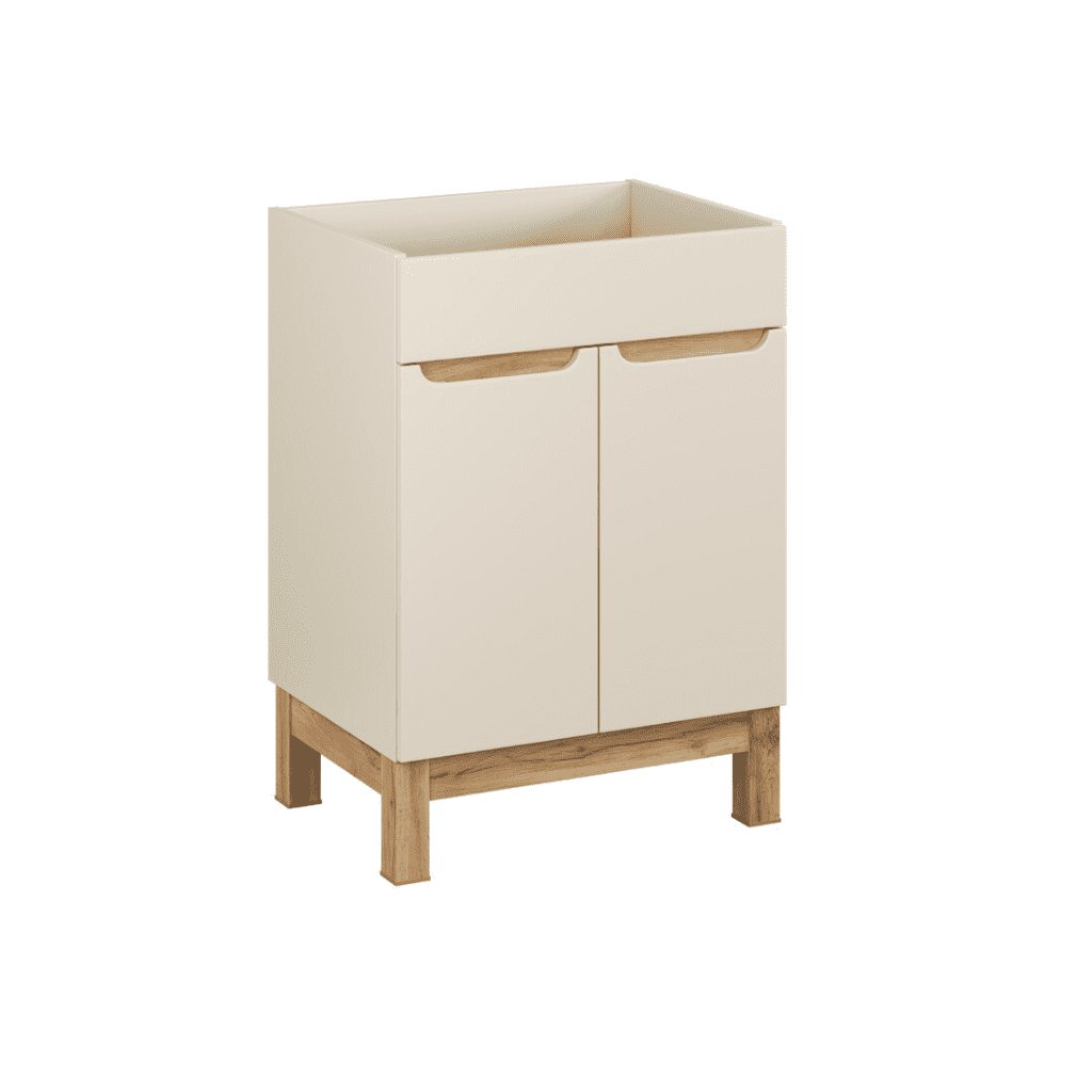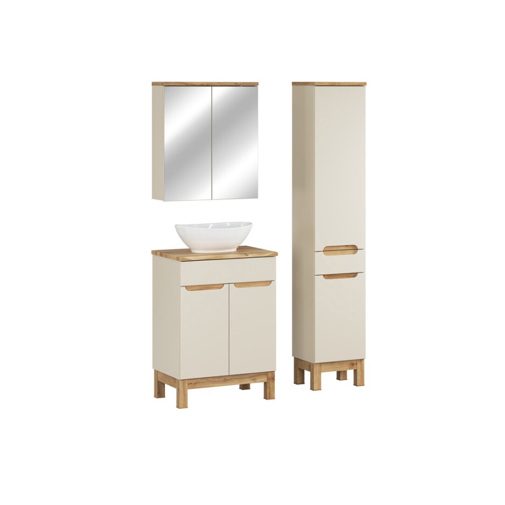Adjon fürdőszobájának új eleganciát a BALI CASHMERE 60/1 szettel . A finom kasmír szín és a meleg fa kombinációja modern, mégis kellemesen otthonos megjelenést kölcsönöz. A modern, 60 cm széles BALI Cashmere 820 mosdószekrény minden fürdőszobában megtalálja a helyét. A szekrény tökéletesen kiegészíti a BALI Cashmere 800 magas szekrényt és a BALI Cashmere 840 tükrös szekrényt . A magas lábak megkönnyítik a fürdőszobai takarítást. A praktikus munkalap mosdóval tökéletesen kiegészíti az egész szettet.