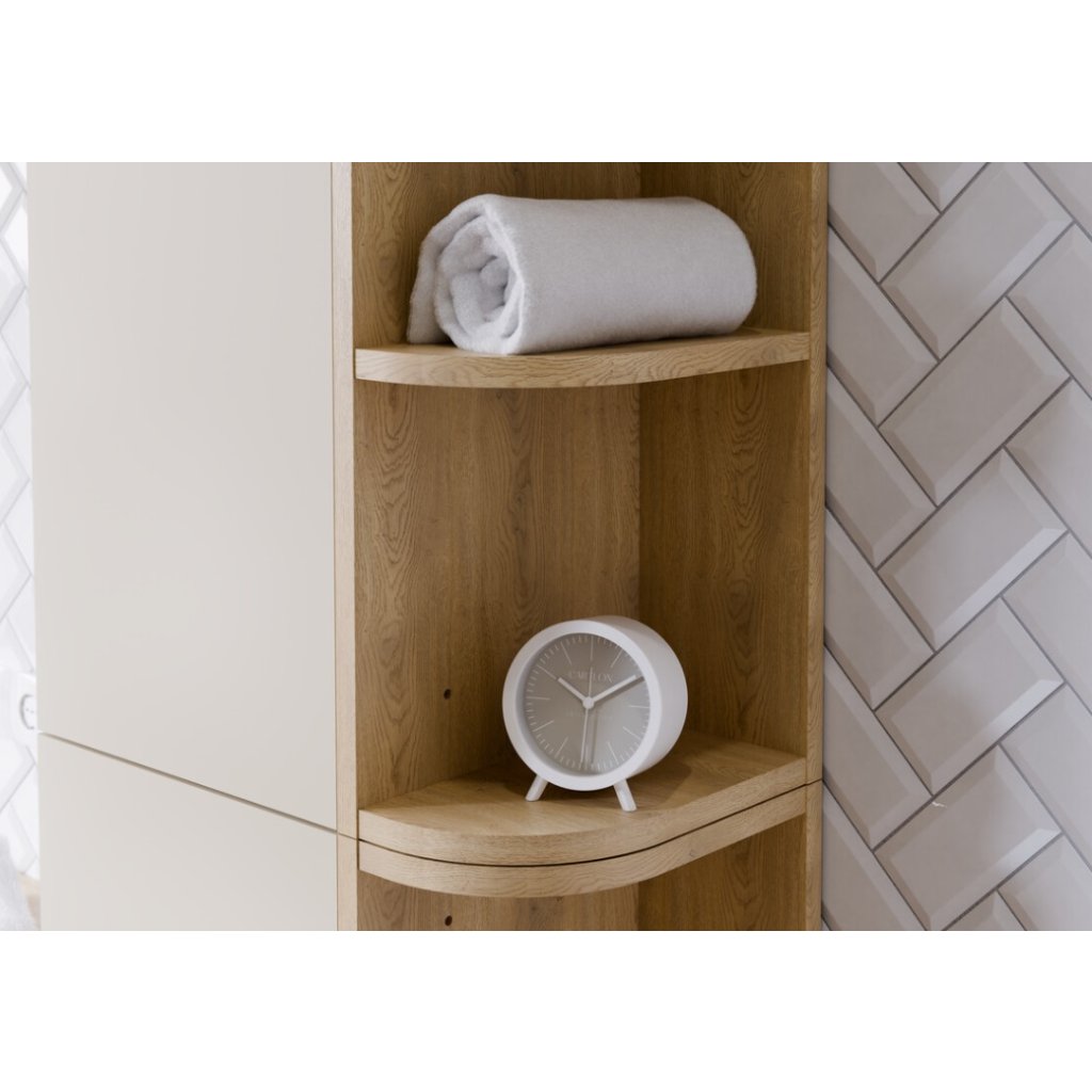 A 15 cm széles CREMONA UN fürdőszobai polc finom részletei természetes melegséget és rendet visznek a minimalista enteriőrökbe. Lekerekített sarkainak formája simán zárja a garnitúrát, és puhaságot, eleganciát kölcsönöz a térnek. A bútor precízen kidolgozott Cremona tölgyfa dekorral készült, amely hűen utánozza a természetes fa szépségét , és otthonos hangulatot teremt. A tartós laminált bútorlap szerkezete garantálja a szilárdságot és a tartósságot. A polc teljes kompatibilitásának köszönhetően könnyedén harmonikus és stílusosan összehangolt teret hozhat létre.