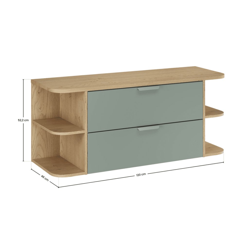 Alkosson egy olyan fürdőszobát, amely nemcsak szép, hanem tökéletesen praktikus is. Az ASTER Green 120 cm-es fürdőszobai mosdószekrény oldalsó nyitott polcokkal ideális kombinációját kínálja a zárt tárolótérnek és a stílusos nyitott polcoknak. A szekrény közepén található két tágas fiók rengeteg helyet biztosít kozmetikumok, higiéniai kellékek és apróságok számára, amelyeket szépen tárolni szeretne. Az oldalsó nyitott polcok ideálisak törölközők, kosarak vagy dekorációk számára, és könnyed, légies megjelenést kölcsönöznek a szekrénynek. A zöld fiókfrontok és a natúr fa dekorációk kombinációja harmonikus és modern. A lekerekített élek és a minimalista integrált fogantyúk hangsúlyozzák az egész ASTER Green sorozat időtlen dizájnját .