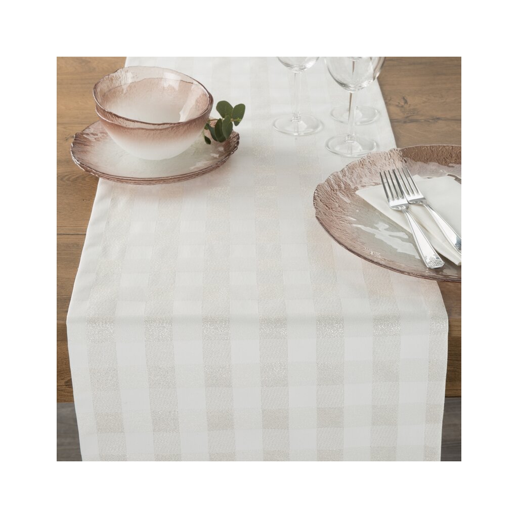 Csillogó abrosz karácsonyi motívummal, szélesség: 40 cm, hossza: 140 cm, szín: krém, összetétel: Anyaga: 65% poliészter, 27% pamut, 8% fémszál