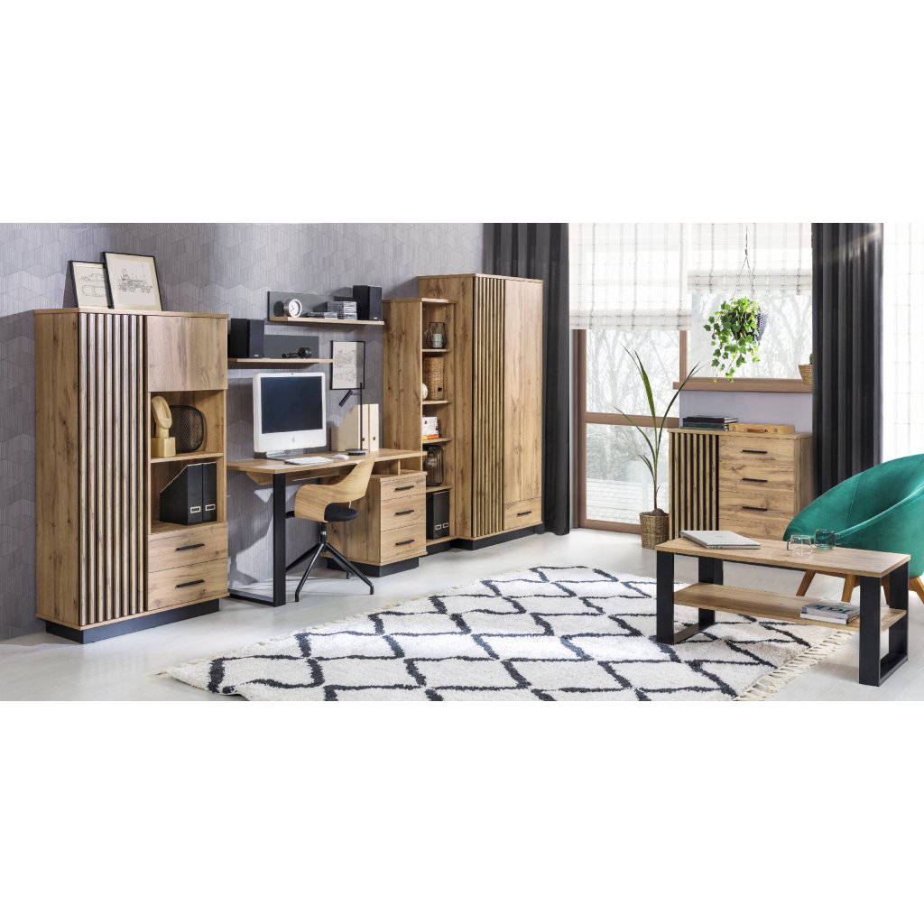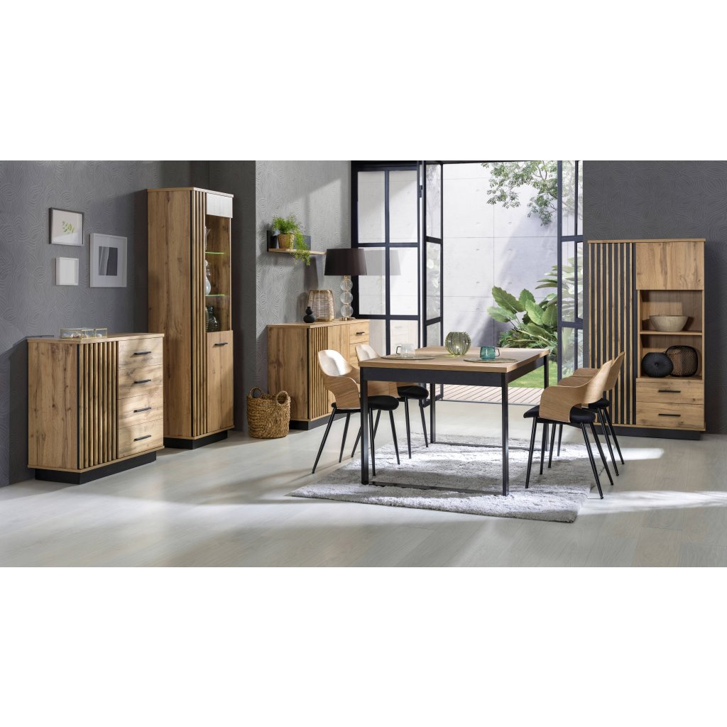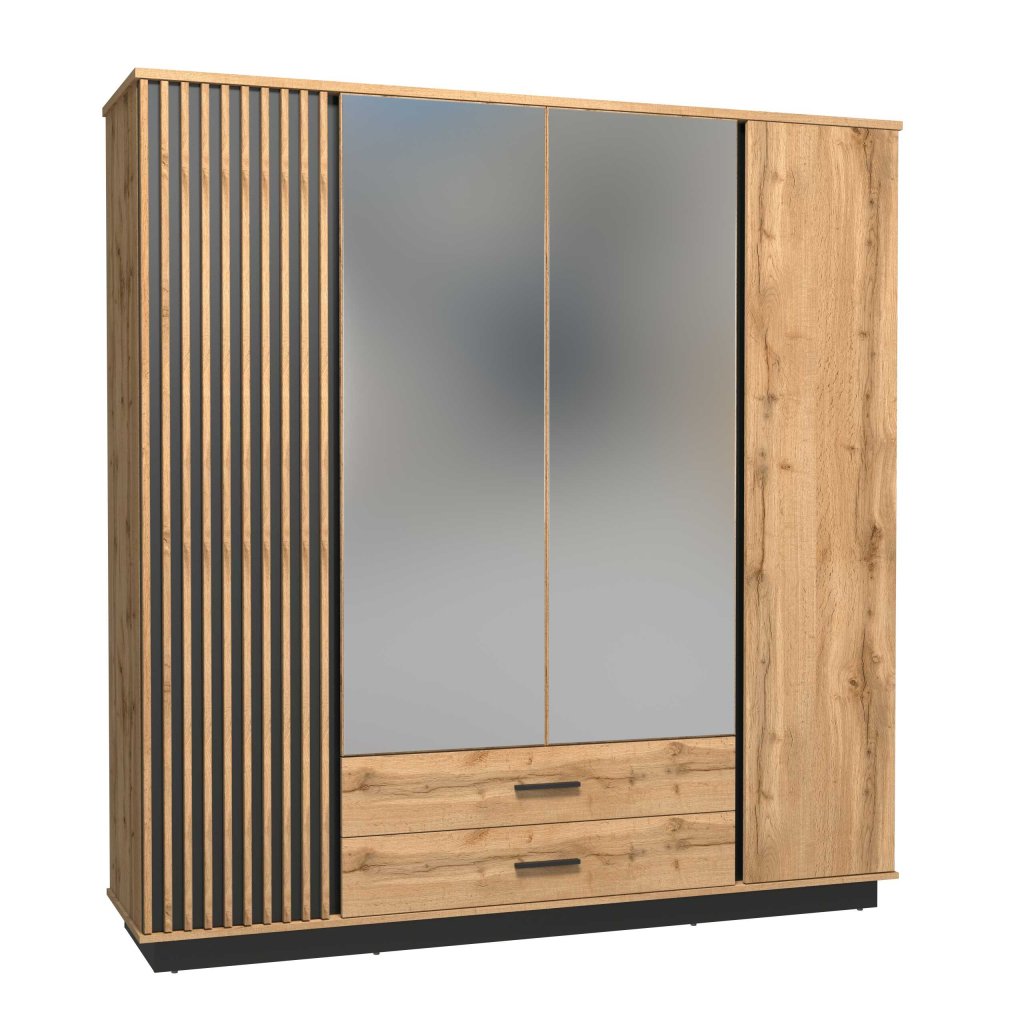 Ha hálószobáját szeretné berendezni, nálunk megtalálja a megoldást. A kifinomult CARMELO LA18 gardrób rengeteg tárolóhelyet kínál a népszerű tölgy és fekete színkombinációban. A lécek egyre népszerűbbek, és A fekete alapnak köszönhetően a garnitúra optikailag nagyobbnak tűnik. Az összbenyomást a fekete lábazat és az egyszerű fekete fogantyúk teszik teljessé, amelyek a Wotan tölgyfa padlóval kombinálva nagyon elegánsak. A CARMELO LA18 gardróbszekrény egy négyajtós, két fiókkal, amelyek közül az egyik léces. Értékelni fogja a bőséges tárolóhelyet és a gardróbszekrény stílusos kialakítását .