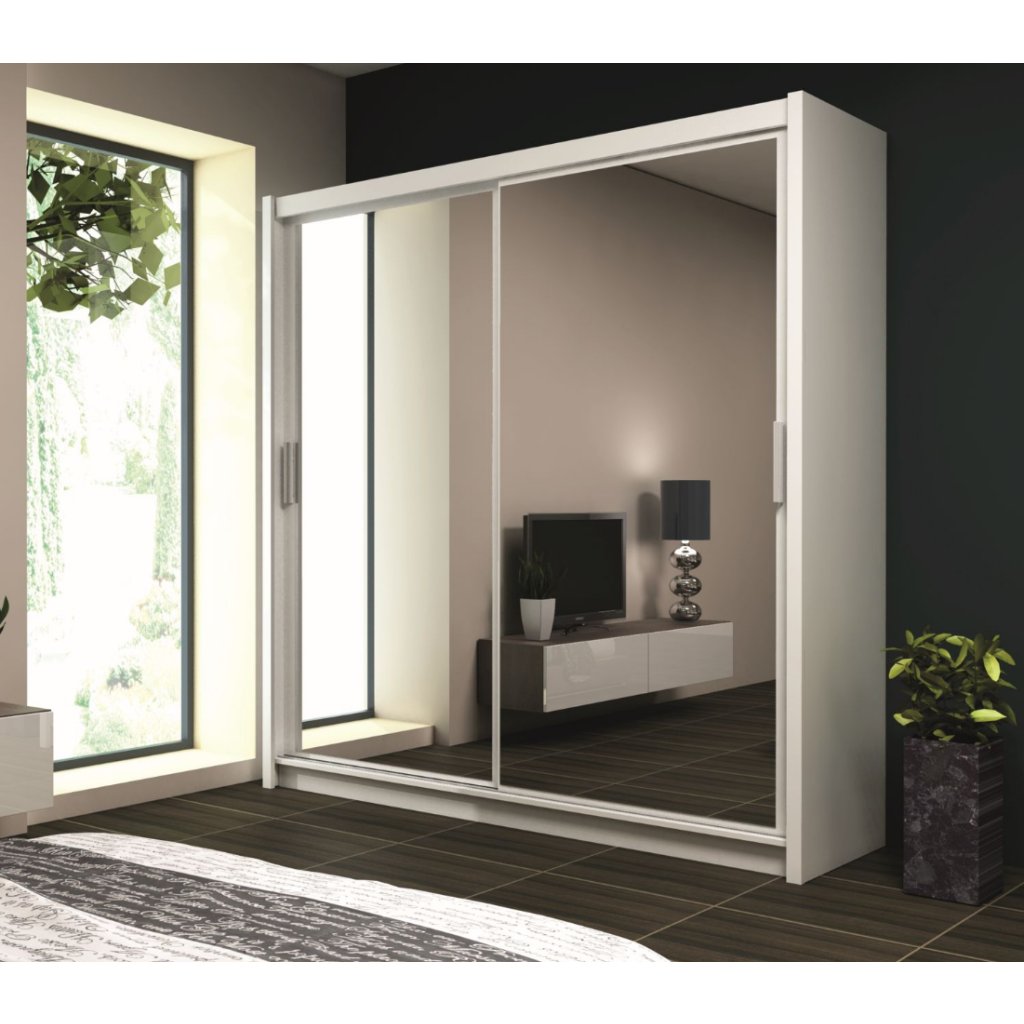 PARIS 203 kombinált kétajtós gardróbszekrény tolóajtókkal, fehér színben. A gardróbszekrény domináns eleme az elegáns ezüst fogantyúk és az ajtó két oldalán található nagyméretű tükrök. PARIS 203 gardróbszekrény rengeteg tárolóhellyel ruhái számára.