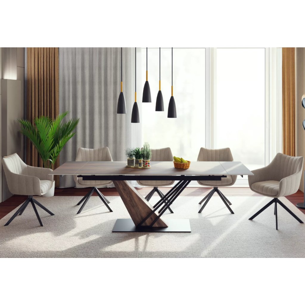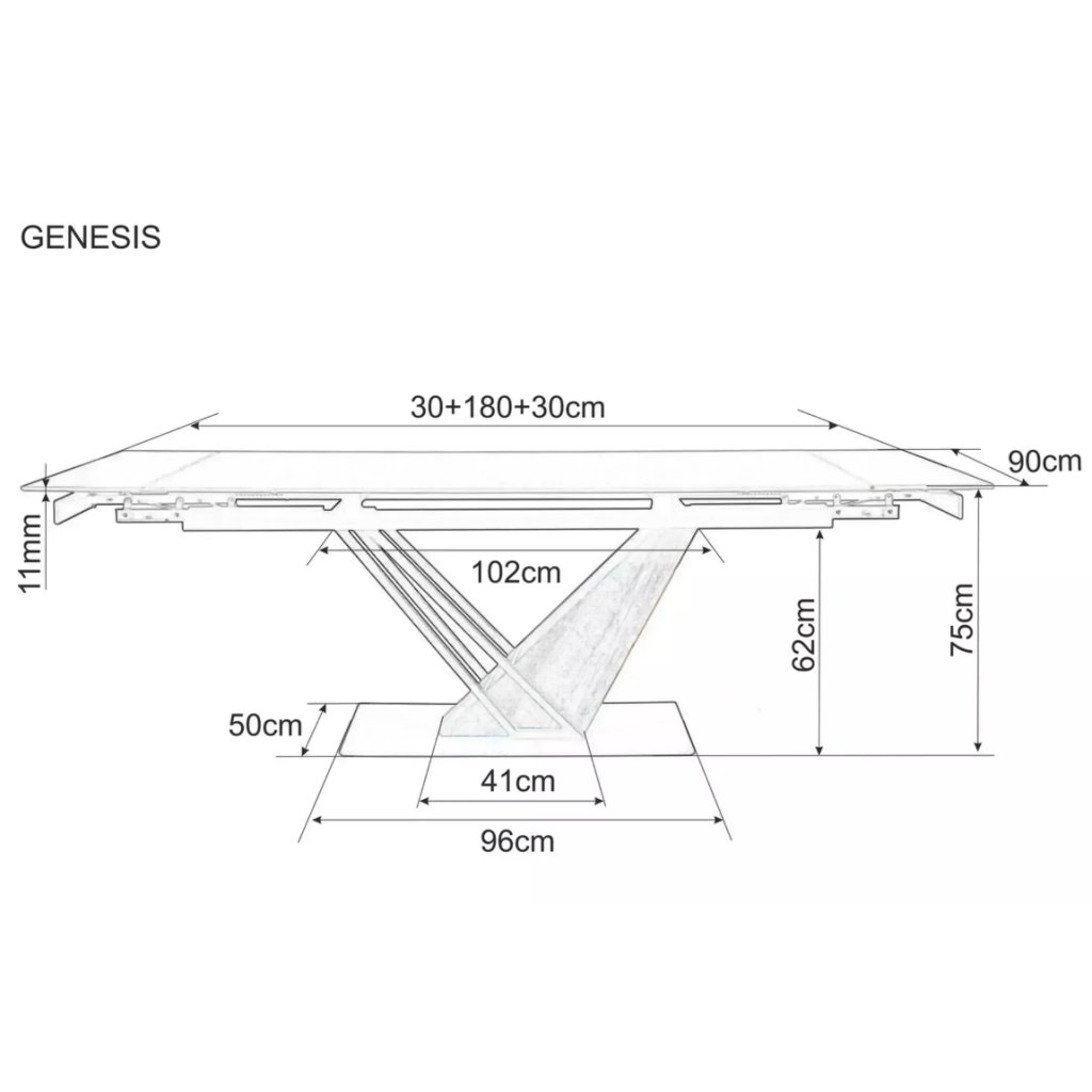 A kiváló minőségű, kihúzható GENESIS étkezőasztal furnérból és MDF-ből, valamint fémből készült. A teteje kerámia. Az asztal kiváló minőségű, az anyaga nem igényel különösebb ápolást, a szennyeződések nedves ruhával letörölhetők.