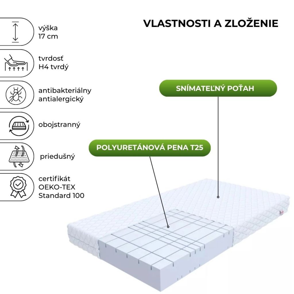 A T25 poliuretán hab (más néven PUR hab T25) egy 25 kg/m³ sűrűségű habfajta, ami közepesen kemény habot eredményez. Népszerűsége a megfizethetősége, alakstabilitása és univerzális felhasználhatósága miatt ismert. A Premium Jersey huzat cipzárjának köszönhetően mind a huzatot, mind a matracot tisztán tarthatod.
