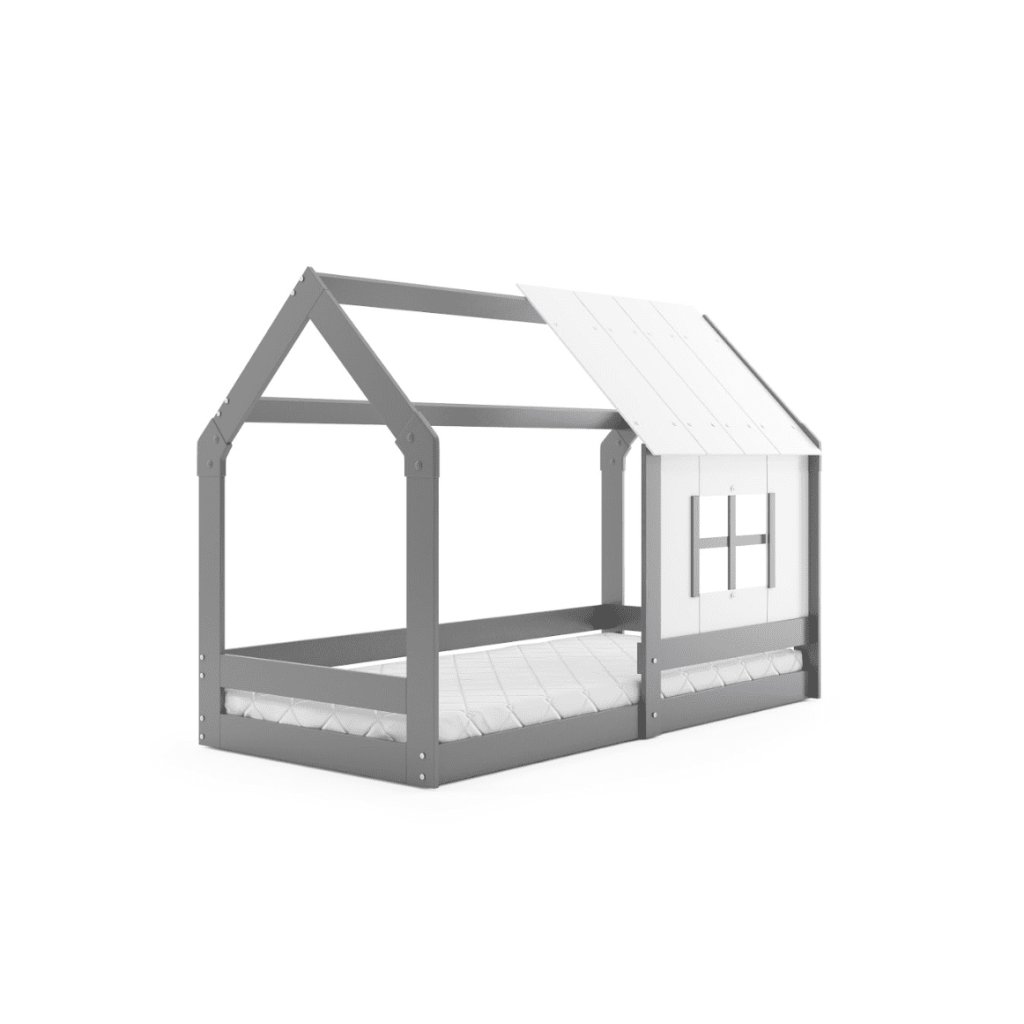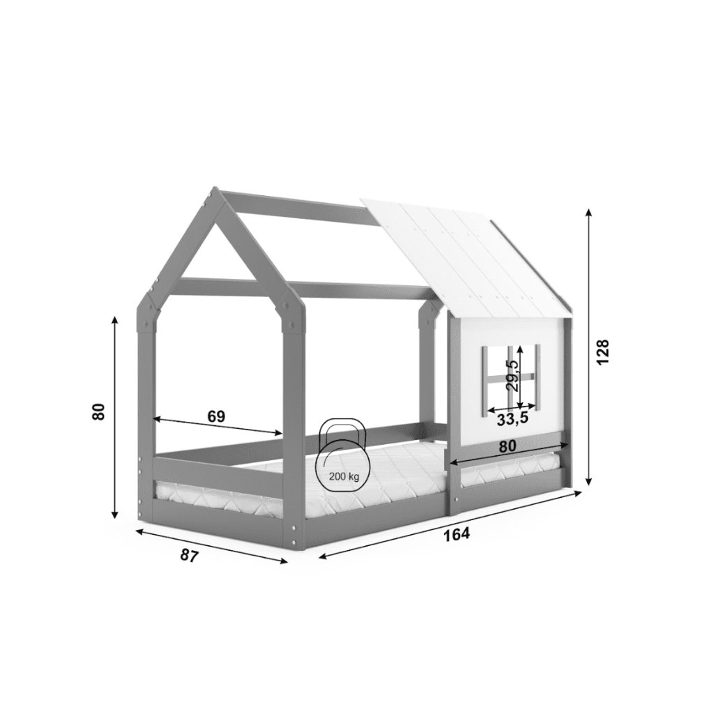 A 80 x 160 cm-es, házikó alakú gyerekágy a kényelem, a biztonság és a játékos dizájn tökéletes kombinációja. Kiváló minőségű fából készült, fehérre festve grafittal kombinálva, így gyönyörűen illeszkedik bármilyen modern vagy klasszikus gyerekszoba enteriőrbe. Az ágy jellegzetessége a házikó alakú, ablakkal ellátott kialakítás , amely hangulatos helyet teremt az alváshoz és a játékhoz. Az ablak autentikus megjelenést kölcsönöz az ágynak, és támogatja a gyermekek fantáziáját - akár búvóhellyé, olvasósarokká vagy egy kis játszótérré alakítják az ágyat. Az ágyat a Montessori-elvek ihlették - az alacsony szerkezet lehetővé teszi a gyerekek számára, hogy önállóan ki- és bemásszanak az ágyba, ami támogatja függetlenségüket és önbizalmukat. A stabil szerkezet és a biztonságos peremkidolgozás garantálja a maximális biztonságot. Az ágy ára tartalmazza a rácsos ágyrácsot , a matracot külön kell megrendelni.