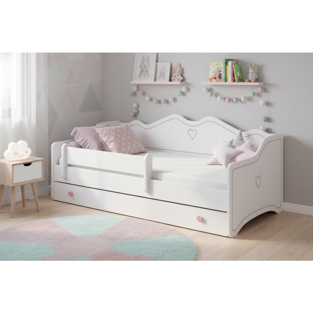 A hihetetlenül népszerű EMKA gyerekágy aranyos kivitelben minden kis hercegnőt elragad majd. A praktikus 80 x 160 cm- es ágyméretet évekig fogja használni, nagy plusz az ágy alatti tágas fiók , amelyet szív alakú fogantyúk tesznek életre. Az EMKA tartalmaz egy ágyat, egy sínt, egy fiókot az ágy alatt, egy matracot és egy rácsot. Tedd élettel a gyerekszobát egy praktikus ággyal, nem fogod megbánni. A dizájnos EMKA fiókos gyermekágy minden kislányt és barátját elbűvöli.