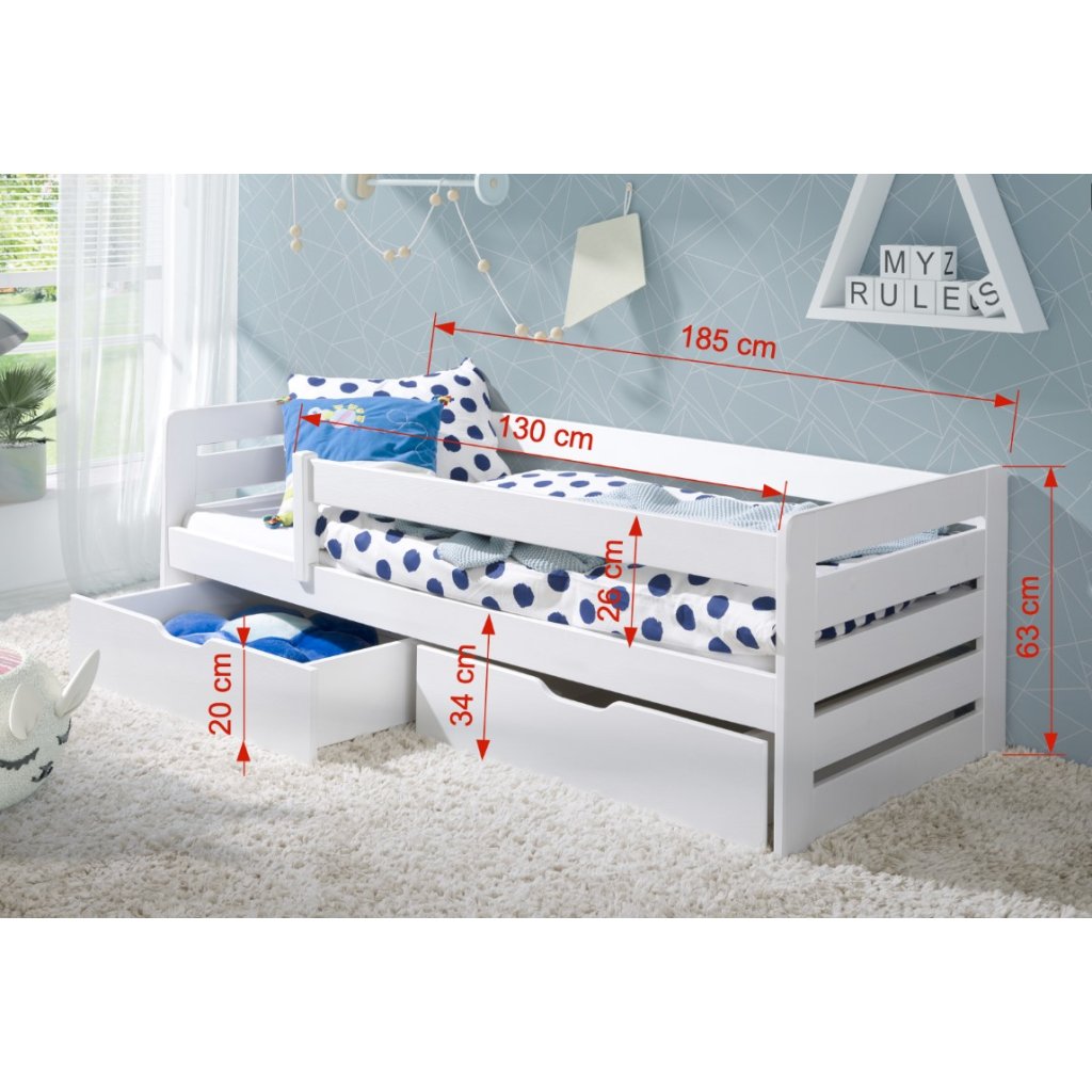 A BELLA egyszemélyes ágy fenyőfából készült, gyermeke biztonsága érdekében korláttal. A felület fehér akrilfestékkel kezelt. Érdeklődés esetén más színben is rendelhet.