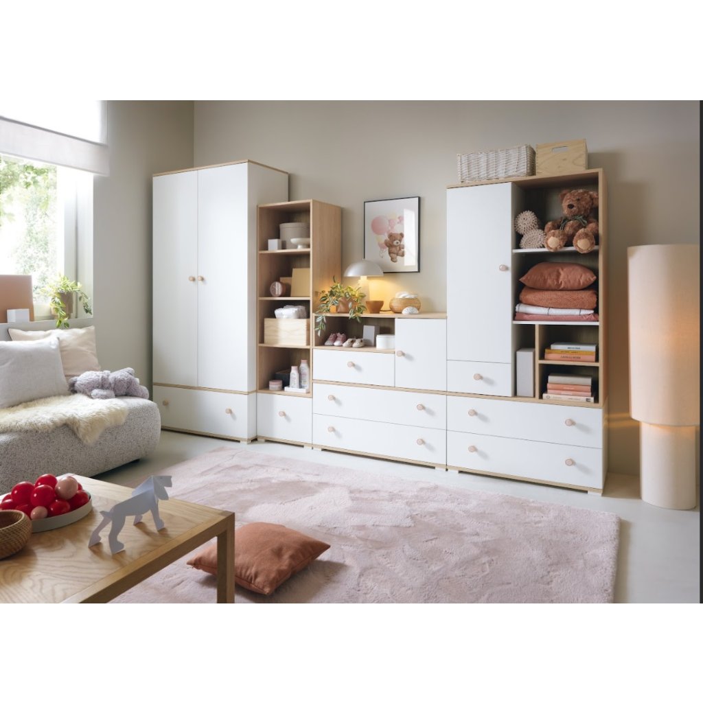 A ZOYA gyerekszoba egy praktikus és stílusos bútordarab, amely bármilyen gyerekszobába alkalmas. A bútorokat a kicsik számára tervezték, a biztonságra, a minőségi kidolgozásra és az időtlen megjelenésre helyezve a hangsúlyt. A rendszer letisztult, egyszerű dizájnt kínál, amely a gyermekkel együtt növekszik. A minimalista stílusnak köszönhetően könnyen megváltoztathatja a szobát dekorációk, például matricák segítségével. A bútorok fehér színben készültek, natúr fa dekorációval, így modern és hangulatos hatást keltenek . A gyerekszoba rengeteg tárolóhelyet kínál. A ruhák, játékok és könyvek mindig rendezettek és kéznél lesznek. Az egyszerű dizájn lehetővé teszi a könnyű kombinálást más bútorokkal.
