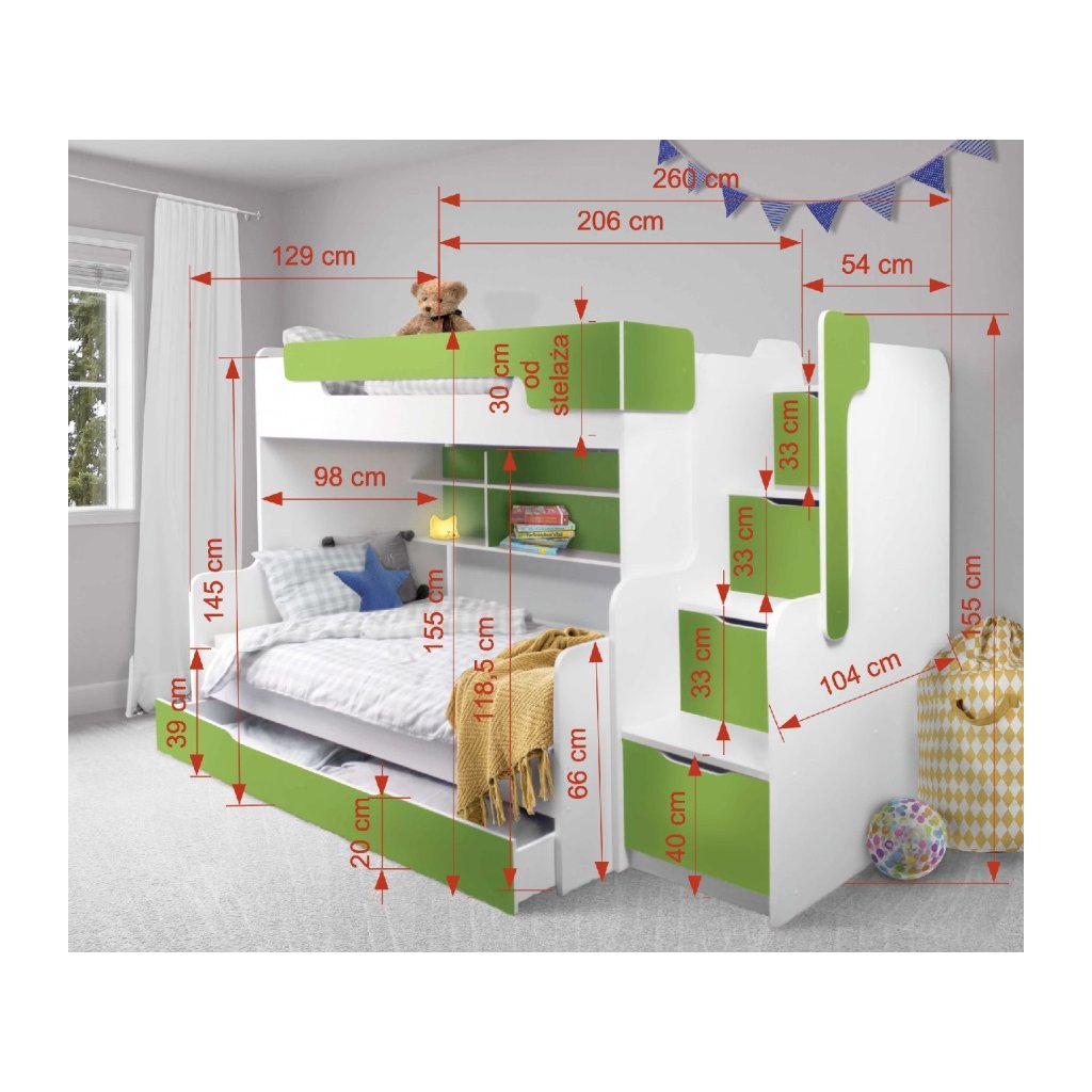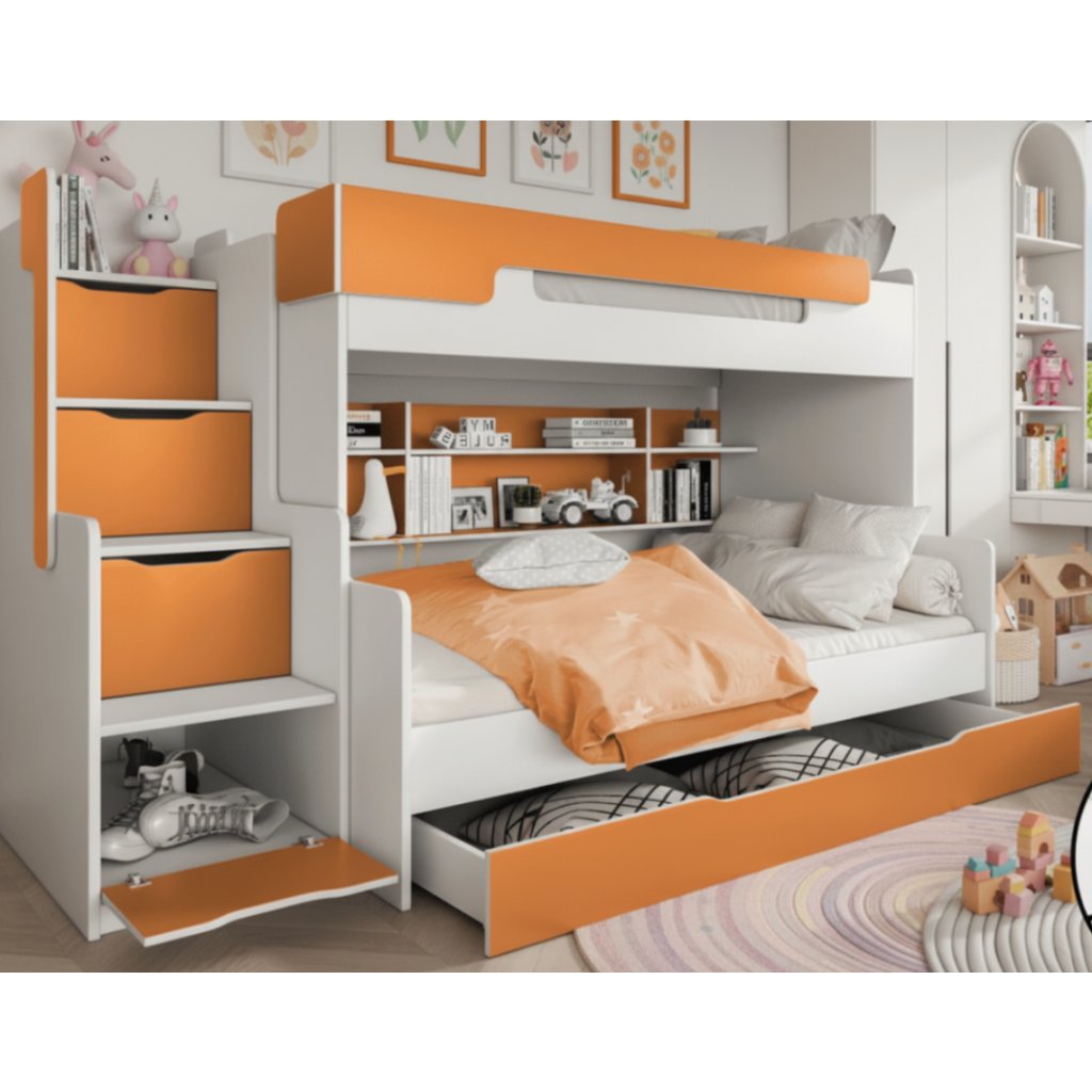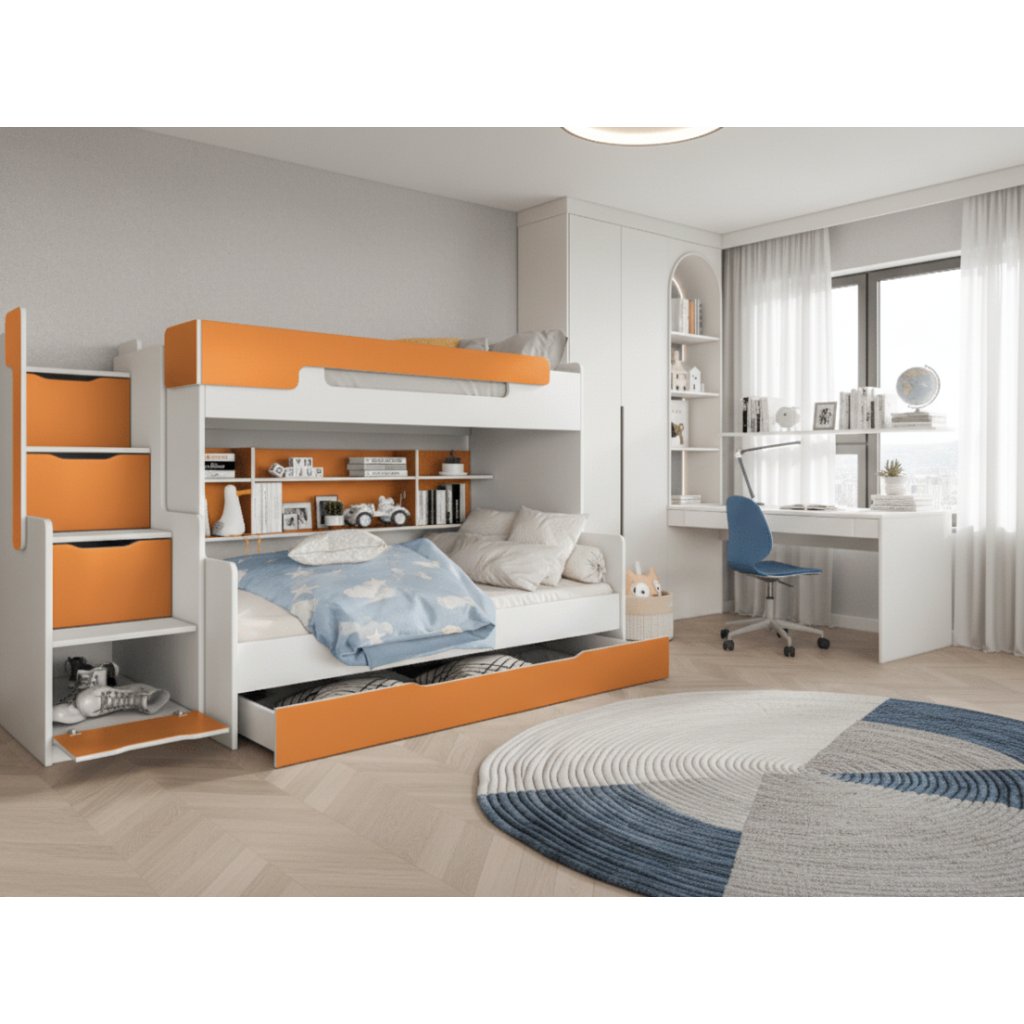 A többfunkciós HARRY ágy tárolóhellyel az ágy alatt és a lépcsőben bármilyen gyerek- vagy diákszobába alkalmas. Szépségével és sokszínűségével , amelyet egyedi és megnyerő báj jellemez, még a felnőtteket is elvarázsolja . Nagy előnye a nagyobb alsó ágy, a polcok és a sok tárolóhely. A HARRY ágy remek választás, ha helyet szeretne spórolni a gyerekszobában, a játékok megtalálhatják a helyüket a lépcsőben vagy a fiókokban. Lehetőség van HARRY habszivacs matrac és Alba matrac rendelésre az ágyhoz. A lépcső jobb vagy bal oldalra helyezhető. A fehér és narancssárga színek érdekes kombinációja élénkíti a belső teret.