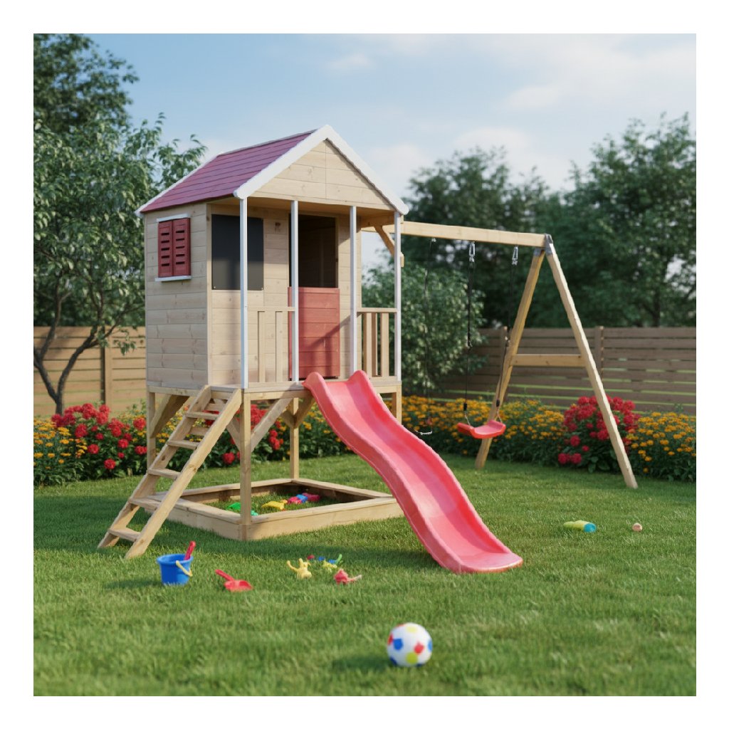 A CHILDHOOD gyermek kerti szett egy magasított faházból áll, amely fedett terasszal, redőnyös ajtókkal és ablakokkal van felszerelve. A házba masszív létralépcsőkön lehet feljutni. Még több szórakozásért a ház egy 175 cm hosszú csúszdával és egy hintával is fel van szerelve. A ház alatti tér homokozóként használható , a deszkák pedig ülőhelyként szolgálhatnak játék közben. Gyermekeidet minden bizonnyal érdekelni fogja a bejáratnál található deszka .