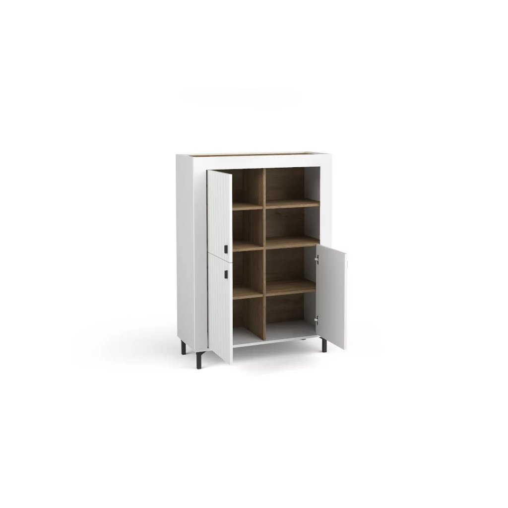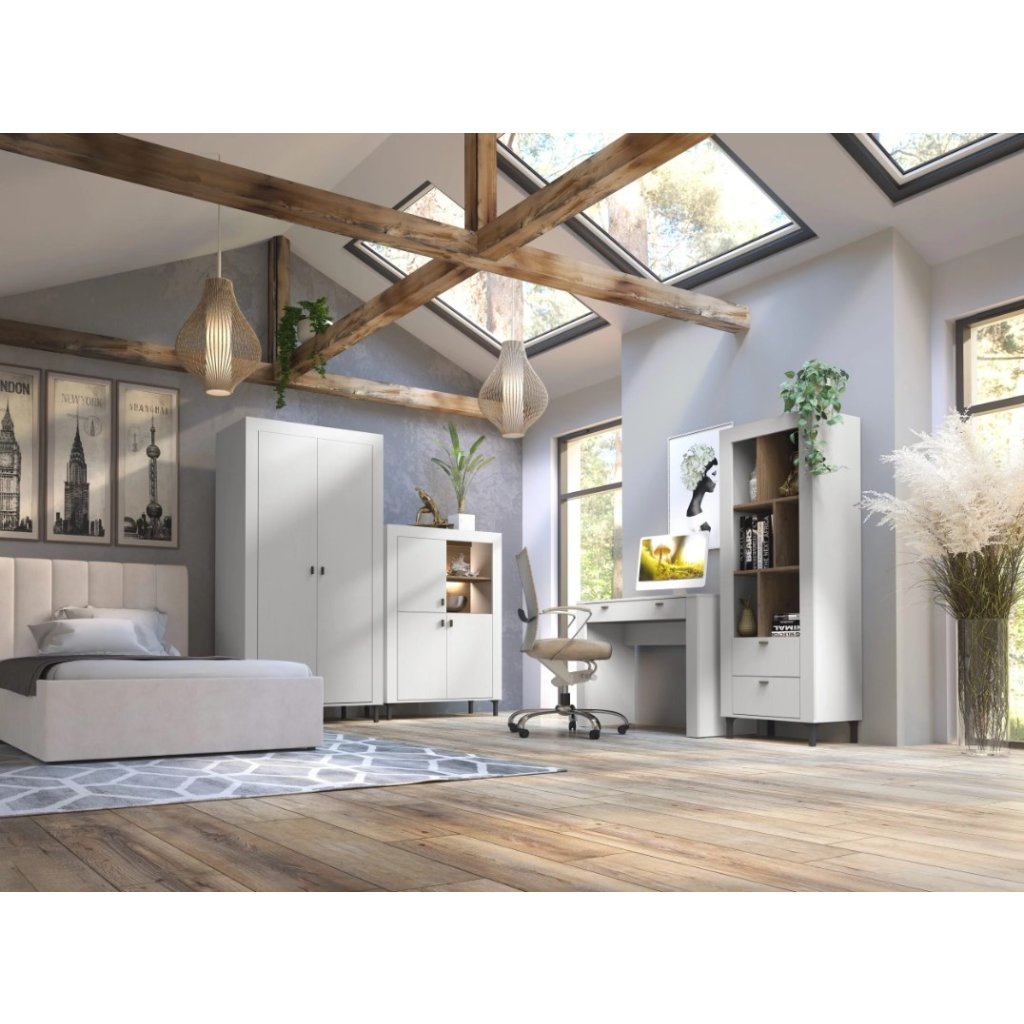 Gyermekszoba MORASS II | A fehér minőségi és tartós laminált anyagból készült , amely hosszú élettartamot és sérülésekkel szembeni ellenállást garantál. A bútorok ABS élekkel rendelkeznek - biztosítják, hogy ne leváljanak és ne deformálódjanak , így a bútorok hosszú távú használat során is tökéletes állapotban maradnak. A 12 cm magas műanyag lábak stabilitást biztosítanak, ugyanakkor könnyű tisztítást tesznek lehetővé a bútor alatt. A fogantyúk is tartós műanyagból készültek, ami hozzájárul az ajtók és fiókok könnyű és kényelmes kinyitásához. A fiókok golyóscsapágyas sínekkel vannak felszerelve a sima és csendes működés érdekében kihúzáskor.