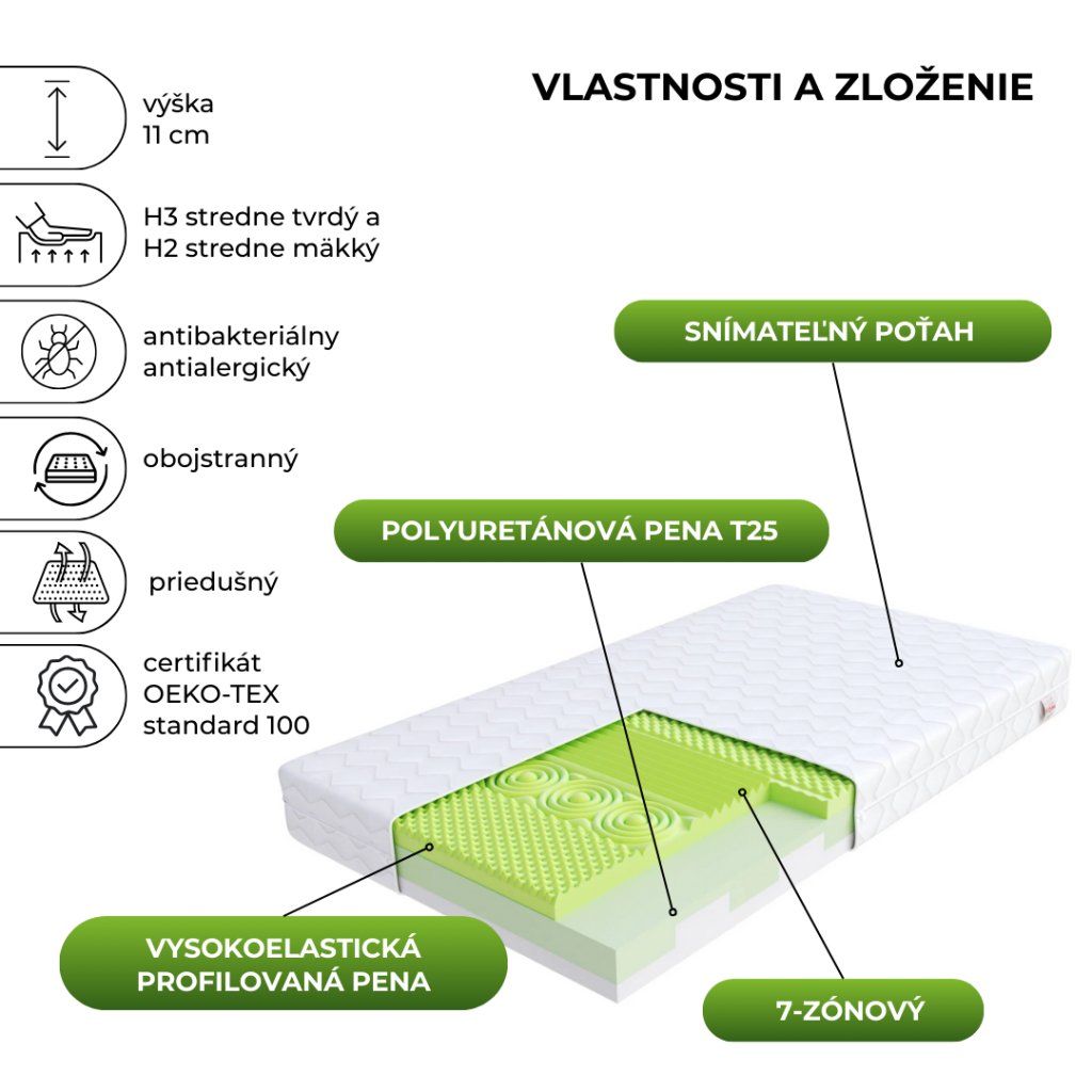 A rendkívül rugalmas HR hab buborékos szerkezettel rendelkezik, amelynek köszönhetően tökéletesen alkalmazkodik az alvó babához. A buborékok nemcsak finoman visszahúzódnak a súlya alatt, hanem biztosítják a matrac légiességét is, ami egyedi antiallergén tulajdonságaiban tükröződik. A kiegészítő töltet T25 poliuretán hab , amely rugalmasságot biztosít a matracnak és növeli az állandó deformációval szembeni ellenállását. Az ADRIANO matrac legfontosabb előnye azonban kétségtelenül a gyártásában felhasznált harmadik hab: profilozott, rendkívül rugalmas . Profilozott felülete hasonló funkciót tölt be, mint a felnőtteknek szánt matracok rugóinak zónás kiválasztása. A profilozott hab 7 zónára osztja a matracot, tökéletesen reagál a gyermek testének egyes részeinek nyomására, alkalmazkodva az igényeihez, kortól és súlytól függetlenül. A profilozásnak köszönhetően a hab finomabban reagál a test könnyebb részeinek (pl. a fej) nyomására, és erősebben a nehezebb testrészek (pl. a gyermek csípője vagy válla) nyomására. A matrac így ortopédiai tulajdonságokra tesz szert. A MICROQUILT huzat kiváló minőségű antiallergén anyagból készült, cipzáras és 30°C-on mosógépben mosható.
