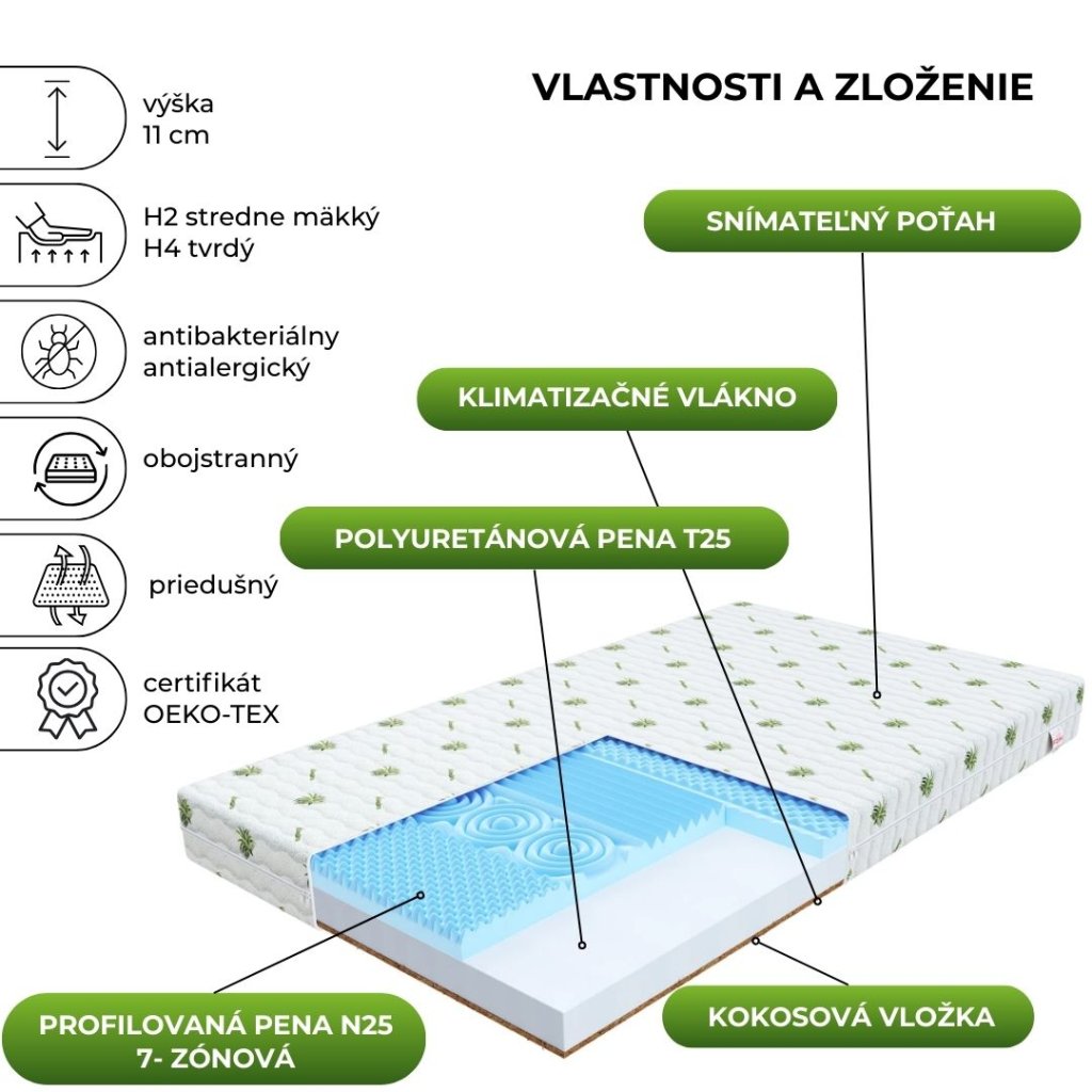 A SORRENTO modell alapja a kiváló minőségű T25 poliuretán hab fokozott ellenállással. Az egyik oldalra kókuszréteg került, amely megerősíti a matracot és megvédi a mikroorganizmusok és atkák behatolásától. A másik oldal profilozott 7 zónás HR habbal van felszerelve. Megnövelt merevségű és ellenálló anyag, megfelelő rugalmasságot biztosítva. A felhasznált alapanyagok légáteresztőbbé teszik a matracot.