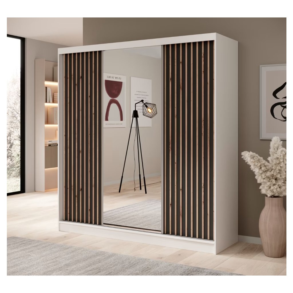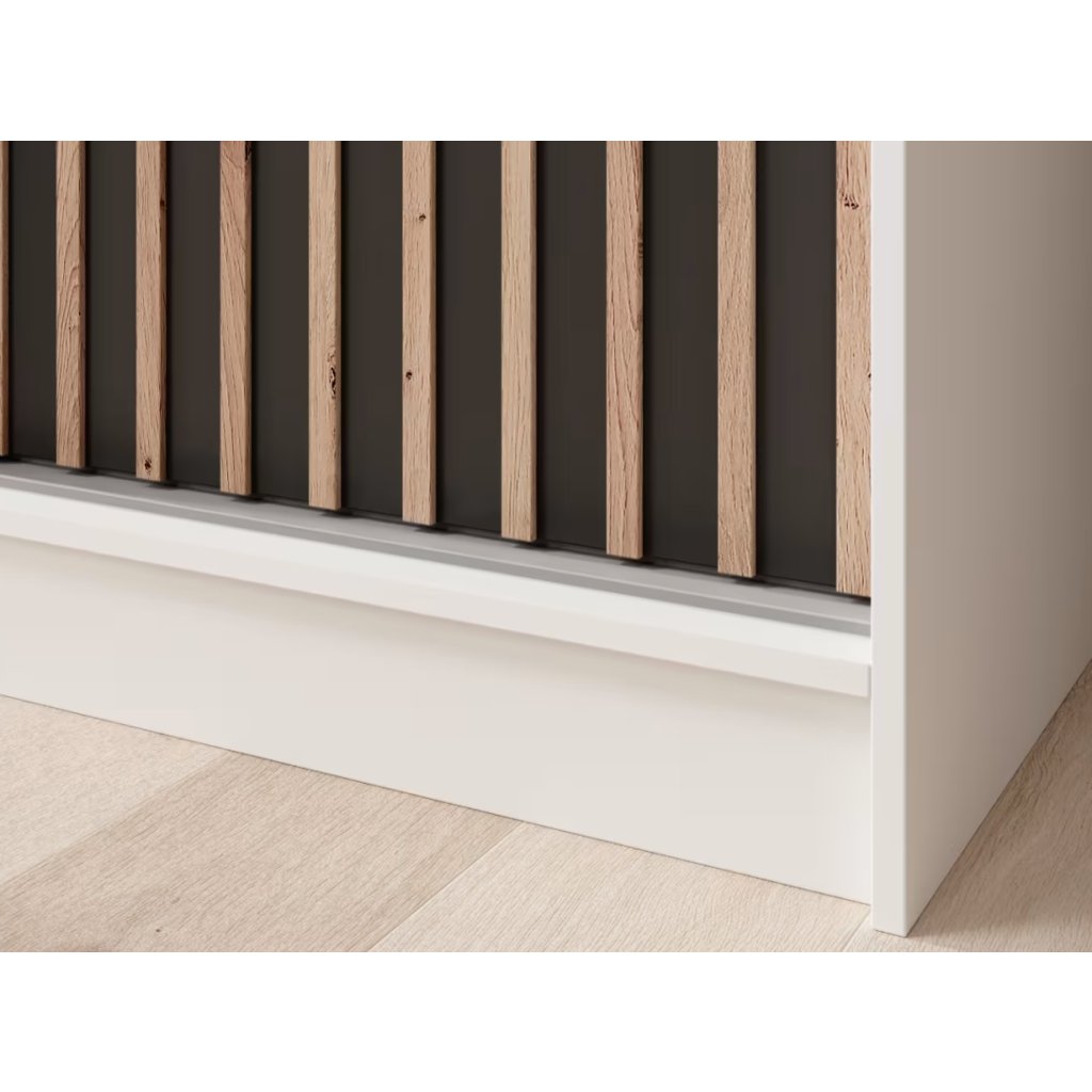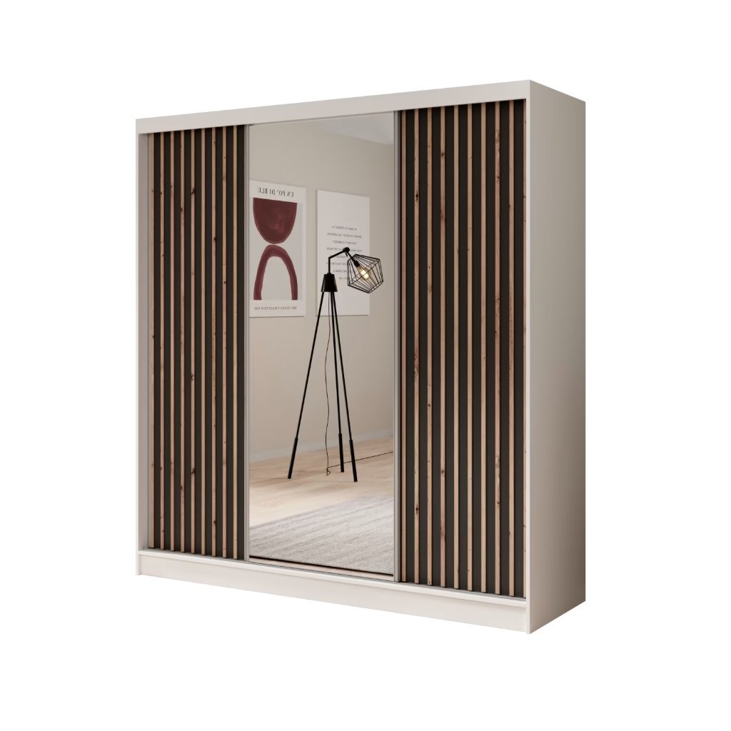 Az IDA tükrös és léces gardróbszekrény modern és elegáns megoldás mindazok számára, akik a funkcionalitás és a stílus kombinációját keresik. 200 cm-es szélességének köszönhetően tágas hálószobákba, előszobákba vagy öltözőkbe is alkalmas, és rengeteg helyet biztosít ruhák és kiegészítők számára. A tolóajtók kényelmes használatot biztosítanak még kisebb helyiségekben is, míg a középen elhelyezett tükör optikailag megnöveli a szobát és megkönnyíti a mindennapi előkészületeket. A gardróbszekrény elejét elegáns lécek díszítik, amelyek a fa melegségét hozzák a belső térbe, és modern jelleget kölcsönöznek a gardróbszekrénynek.