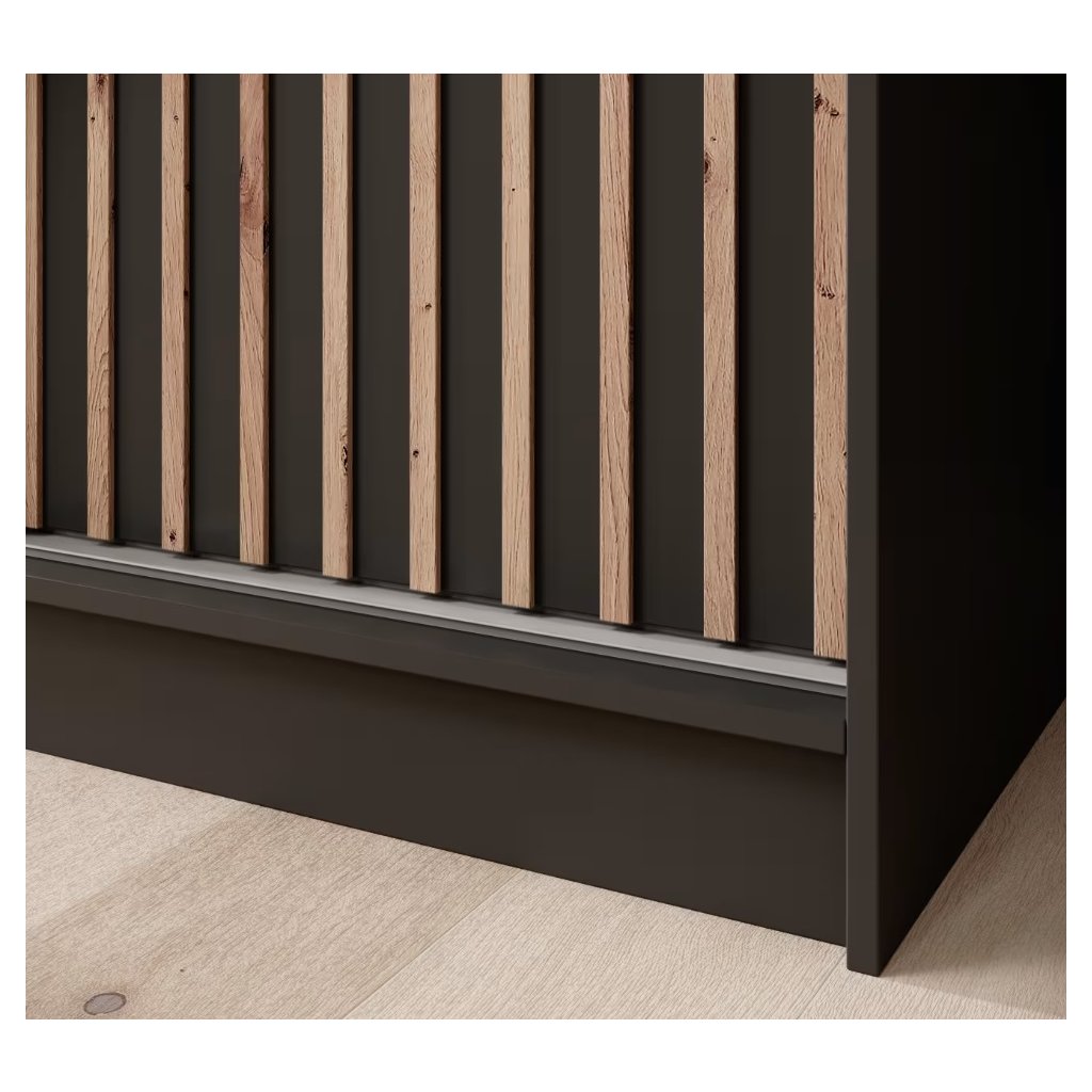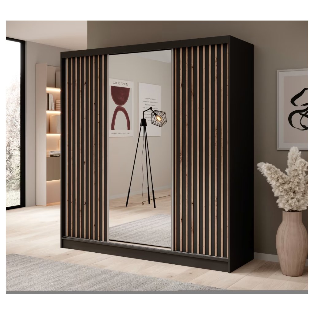 Az IDA tükrös és léces gardróbszekrény modern és elegáns megoldás mindazok számára, akik a funkcionalitás és a stílus kombinációját keresik. 200 cm-es szélességének köszönhetően tágas hálószobákba, előszobákba vagy öltözőkbe is alkalmas, és rengeteg helyet biztosít ruhák és kiegészítők számára. Polcokkal, vállfákkal és fiókokkal rendelkezik. A tolóajtók kényelmes használatot biztosítanak még kisebb helyiségekben is, míg a középen elhelyezett tükör optikailag megnöveli a szobát és megkönnyíti a mindennapi előkészületeket. A gardrób elejét elegáns lécek díszítik, amelyek a fa melegségét hozzák a belső térbe, és modern jelleget kölcsönöznek a gardróbszekrénynek.