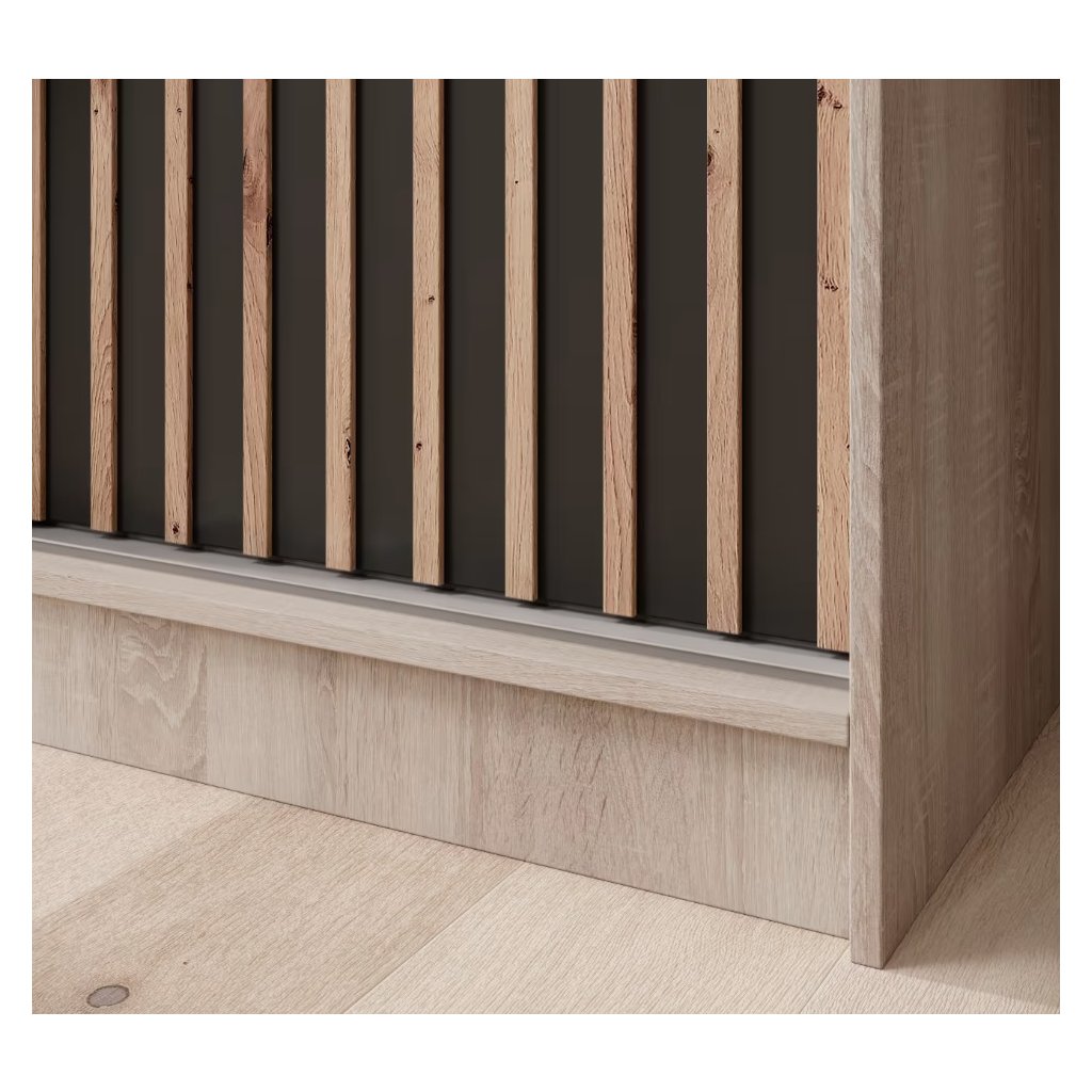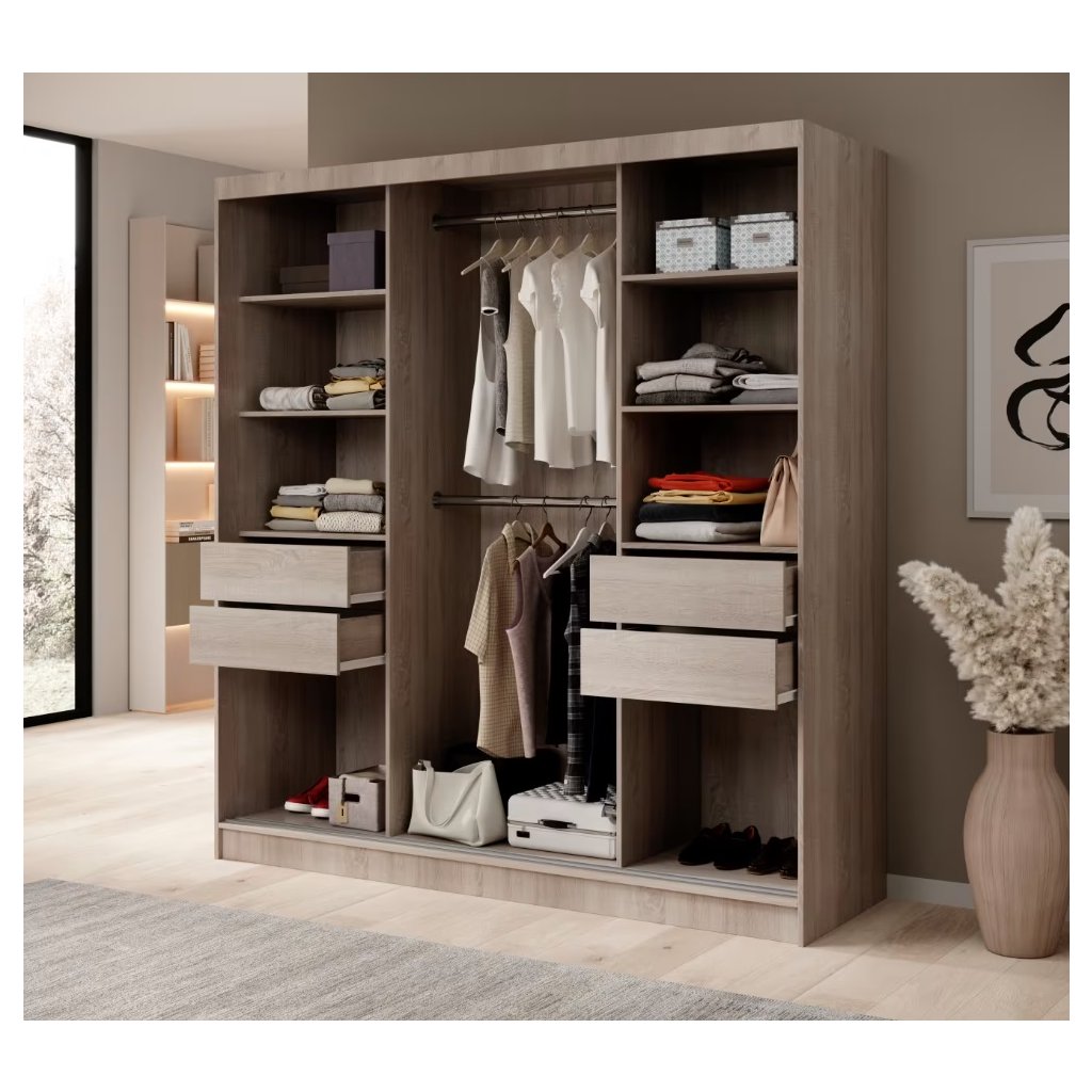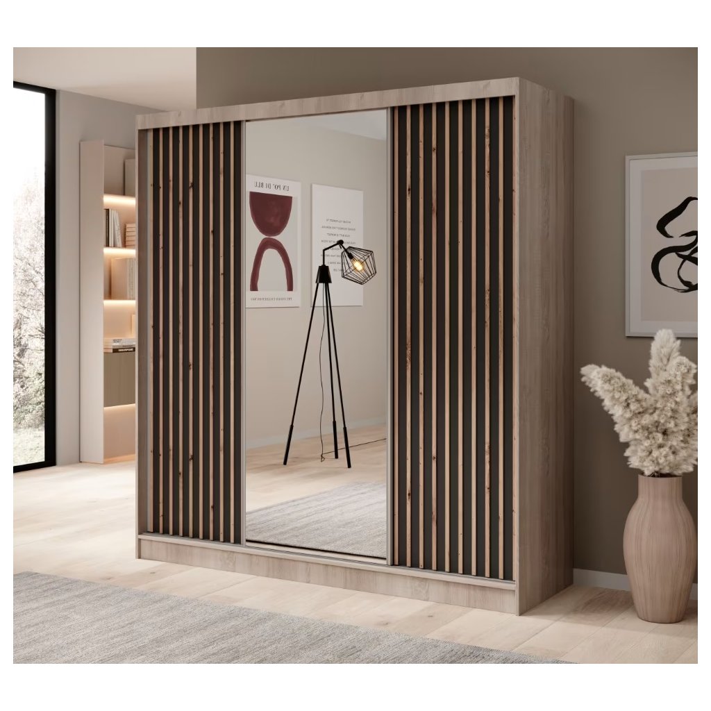 Az IDA tükrös és léces gardróbszekrény modern és elegáns megoldás mindazok számára, akik a funkcionalitás és a stílus kombinációját keresik. 200 cm-es szélességének köszönhetően tágas hálószobákba, előszobákba vagy öltözőkbe is alkalmas, és elegendő helyet biztosít ruhák és kiegészítők számára. A tolóajtók kényelmes használatot biztosítanak még kisebb helyiségekben is, míg a középen elhelyezett tükör optikailag megnöveli a szobát és megkönnyíti a mindennapi előkészületeket. A gardróbszekrény elejét elegáns lécek díszítik, amelyek a fa melegségét hozzák a belső térbe, és modern jelleget kölcsönöznek a gardróbszekrénynek. A gardróbszekrény háromajtós kialakítású, sonoma tölgyfa és fehér kombinációja alapján.