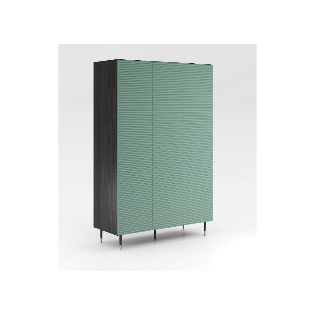 Luxus és stílusos IMPERIAL I07 ruhásszekrény kellemes színben. Az elegáns, bordázott pisztáciazöld elülső részek biztosítják, hogy ez a ruhásszekrény nemcsak praktikus, hanem jellegzetes dizájnnal is rendelkezik . A pisztáciazöld szín frissességet és eredetiséget kölcsönöz a ruhásszekrénynek , ami egyedivé és összetéveszthetetlenné teszi. A ruhásszekrény háromajtós, PUSH TO OPEN rendszerrel, amely lehetővé teszi a nyitását klasszikus fogantyúk használata nélkül. A magasabb , fekete-arany kombinációjú lábak nagyon stílusosak.