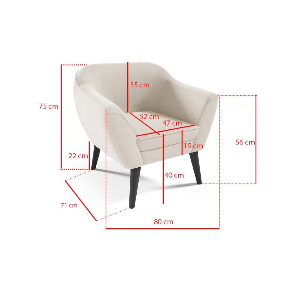 A karosszék kellemes tapintású szövettel kárpitozott , amely magas kényelmet és esztétikus megjelenést biztosít. Ez a bársony anyag elegáns megjelenést kölcsönöz a karosszéknek, és puha tapintású, ami növeli az ülési kényelmet. A falábak gazdagítják az ágy összképét. A karosszék impregnálható , vagy szükség esetén univerzális tisztítószerrel tisztítható.