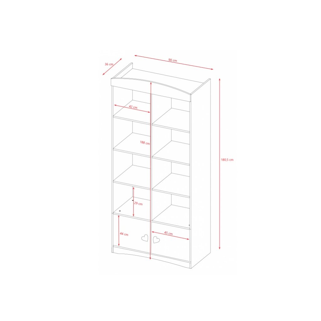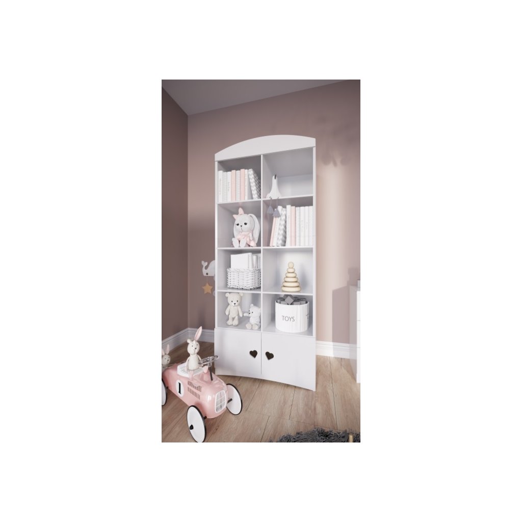 A fehér JULIA könyvespolcot könnyed, mégis elegáns dizájn és bájos fogantyúk jellemzik. A Julia bútorok a praktikumot a finom esztétikával ötvözik, és hangulatos, harmonikus belső teret teremtenek . A precízen kidolgozott részletek és az átgondolt elemek elragadtatják a háztartás legfiatalabb tagjait, míg a szülők értékelni fogják a beépített biztonsági rendszereket . A fehér dizájn könnyen kombinálható különböző stílusú bútorokkal, és frissességet, könnyedséget visz a térbe. A fogantyúk dekoratív, szív alakú kivágásokként vannak kialakítva, amelyek egyedi jelleget kölcsönöznek a könyvespolcnak . A magas könyvespolc polcokkal és tágas rekesszel rendelkezik például játékok számára.