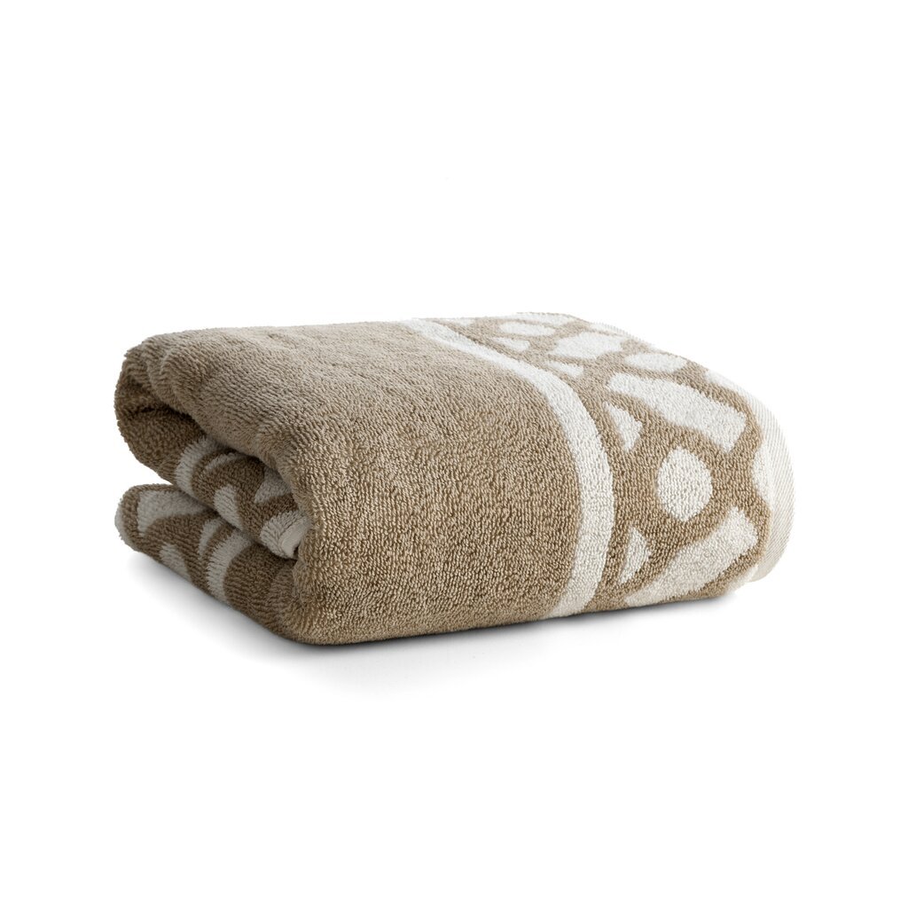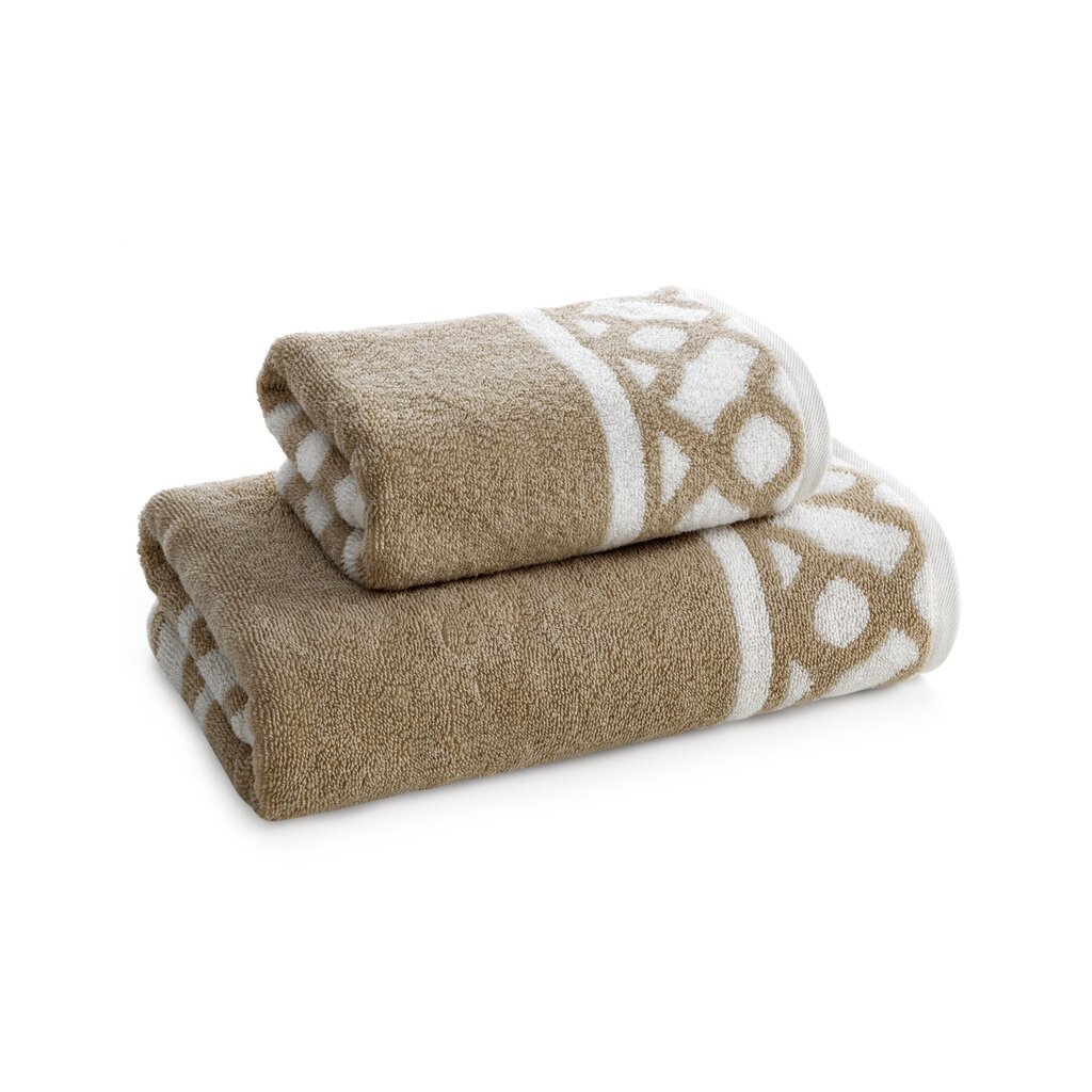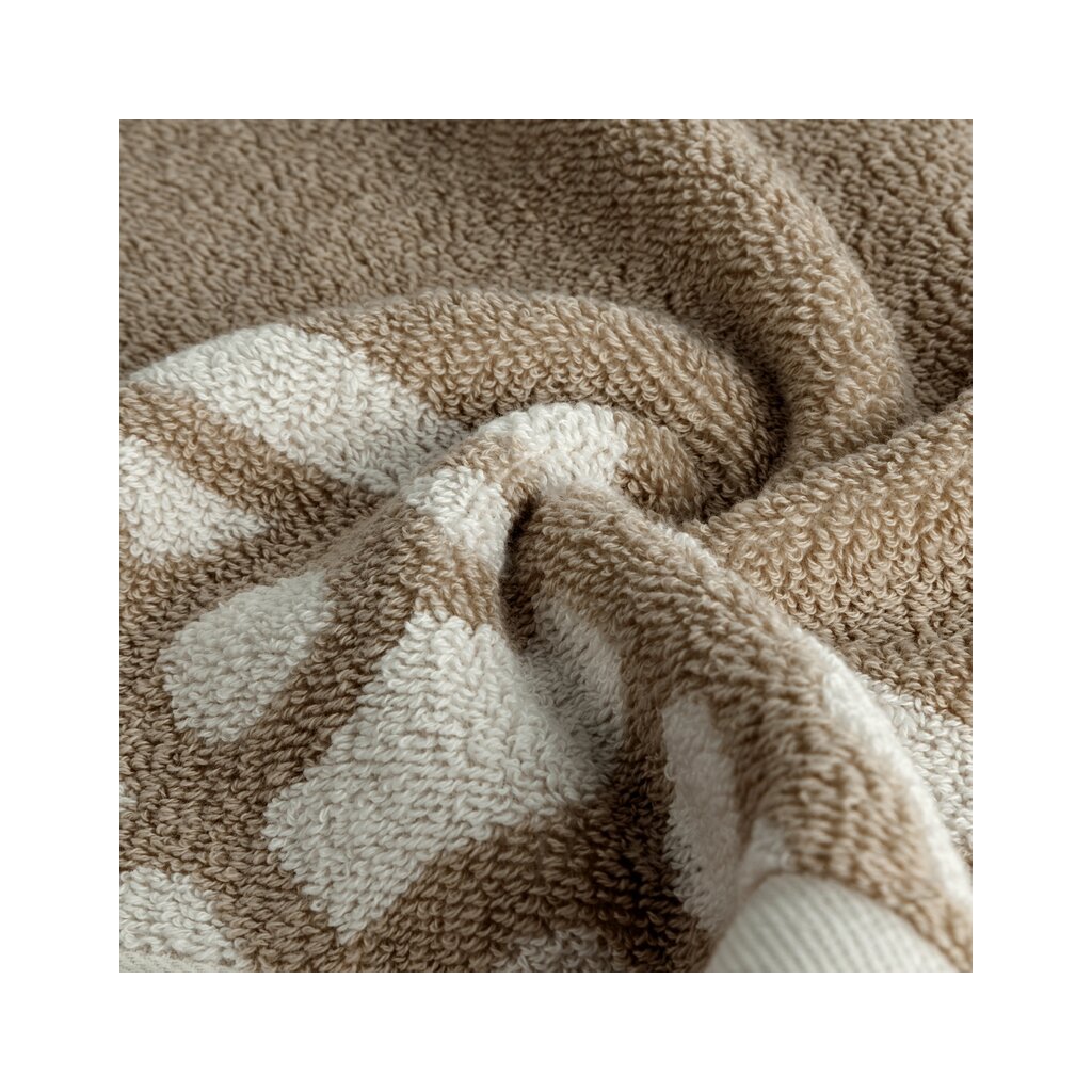 Pamut fürdőlepedő geometrikus mintával díszített szegélyekkel. szélesség: 70 cm, hosszúság: 140 cm, szín: bézs, súly: 500 GSM, összetétel: anyag: 100% pamut