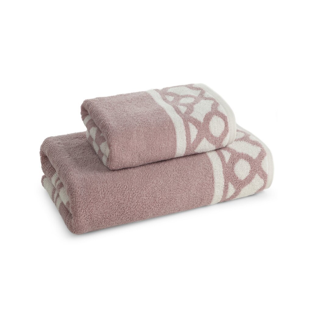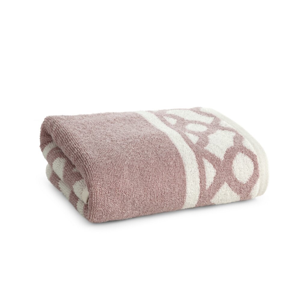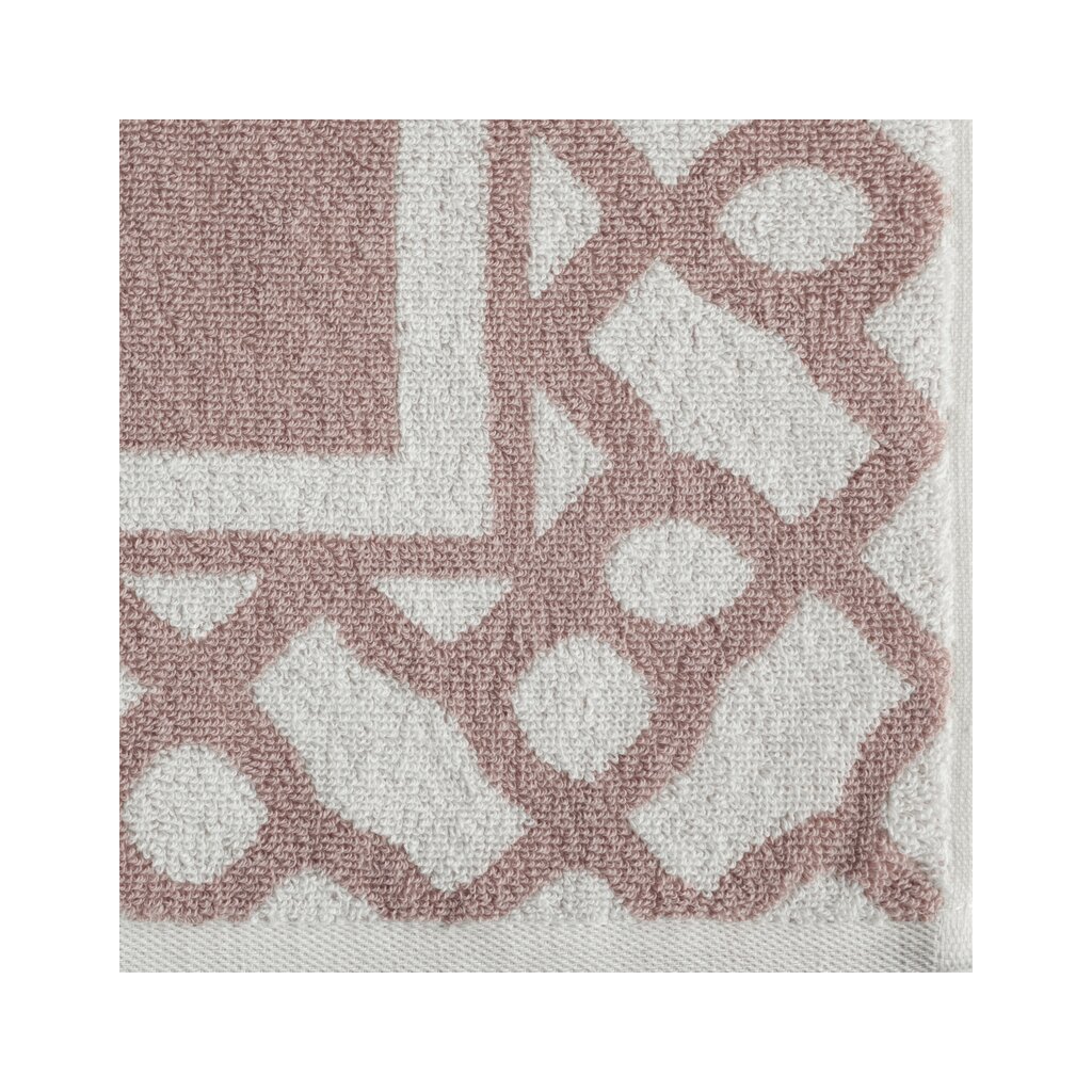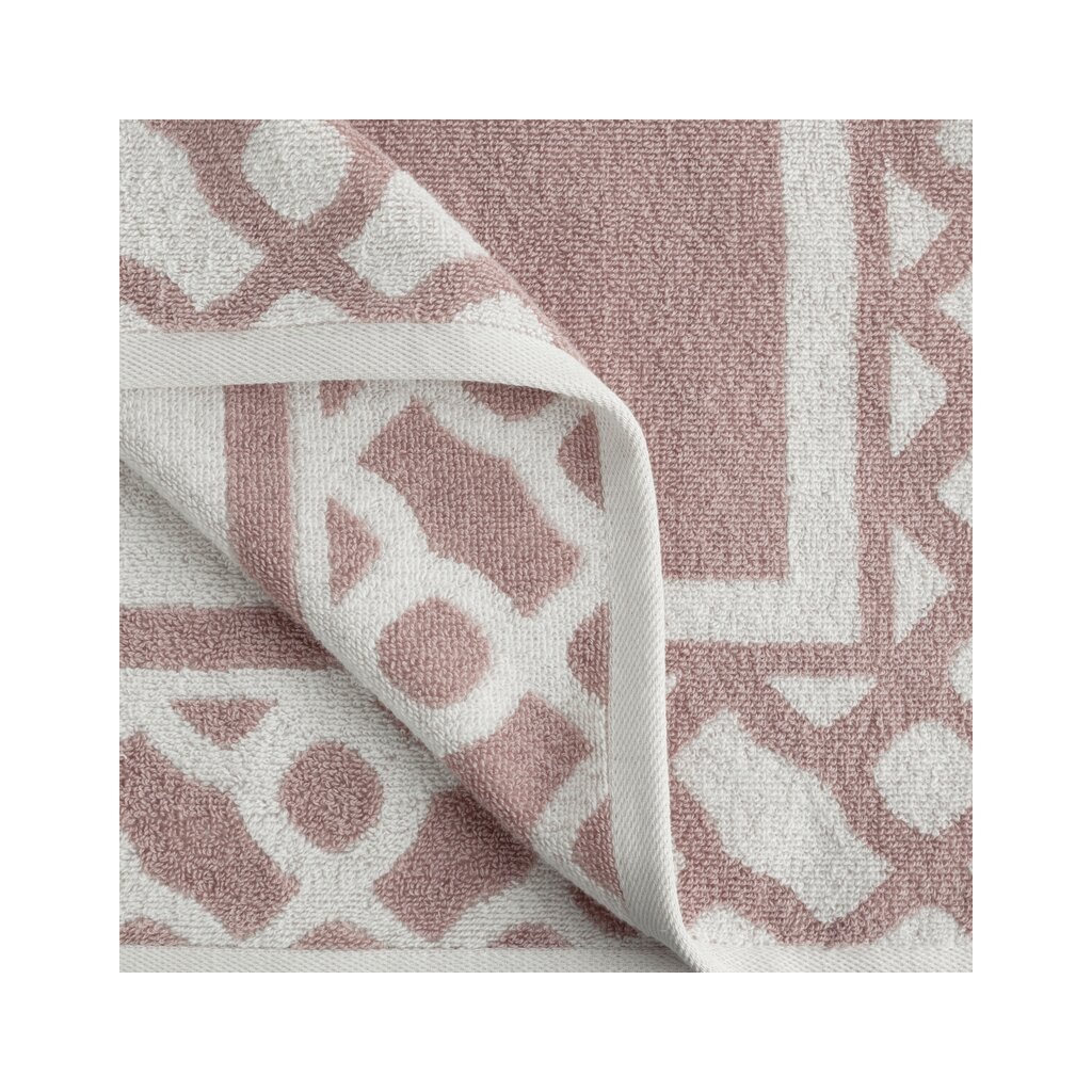 Pamut fürdőlepedő geometrikus mintával díszített szegélyekkel. Szélesség: 70 cm, Hossz: 140 cm, Szín: púderrózsaszín, Súly: 500 GSM, Összetétel: Anyag: 100% pamut