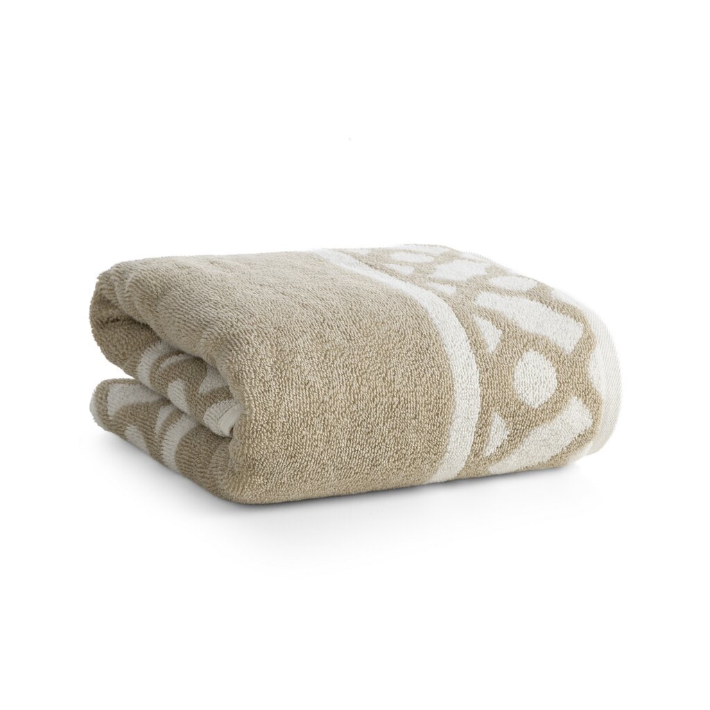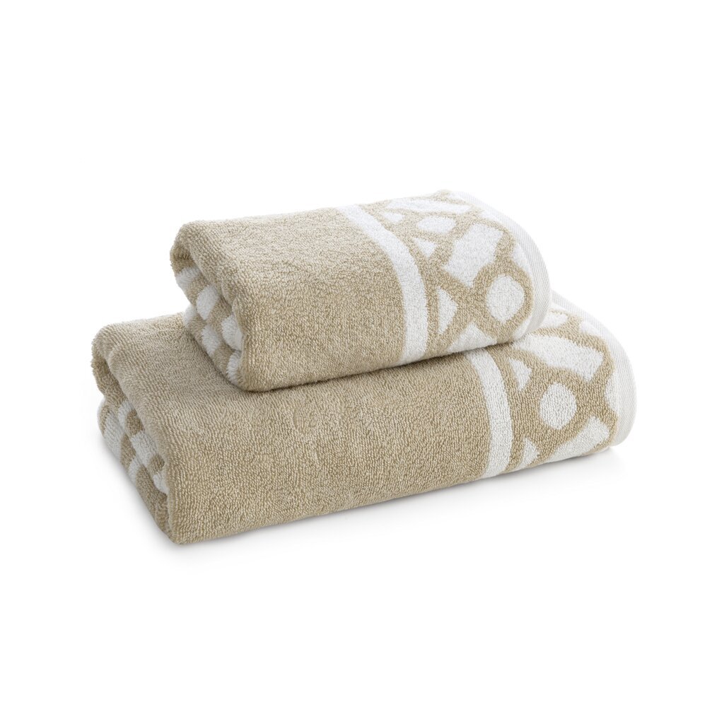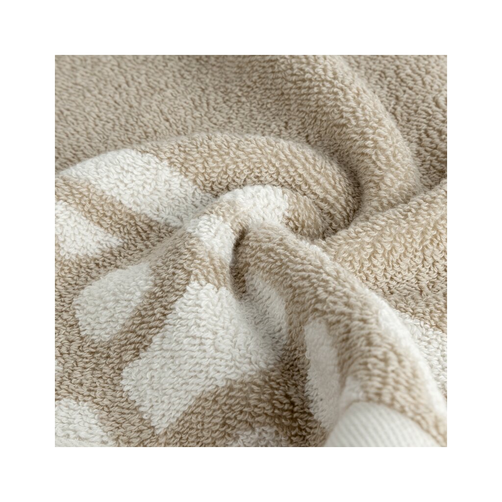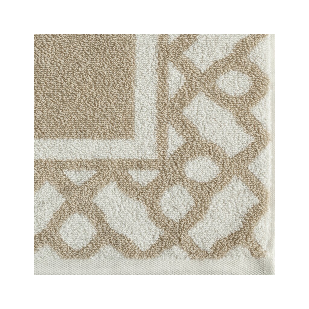 Pamut fürdőlepedő geometrikus mintával díszített szélekkel. Szélesség: 70 cm, Hossz: 140 cm, Szín: világos bézs, Súly: 500 GSM, Összetétel: Anyag: 100% pamut