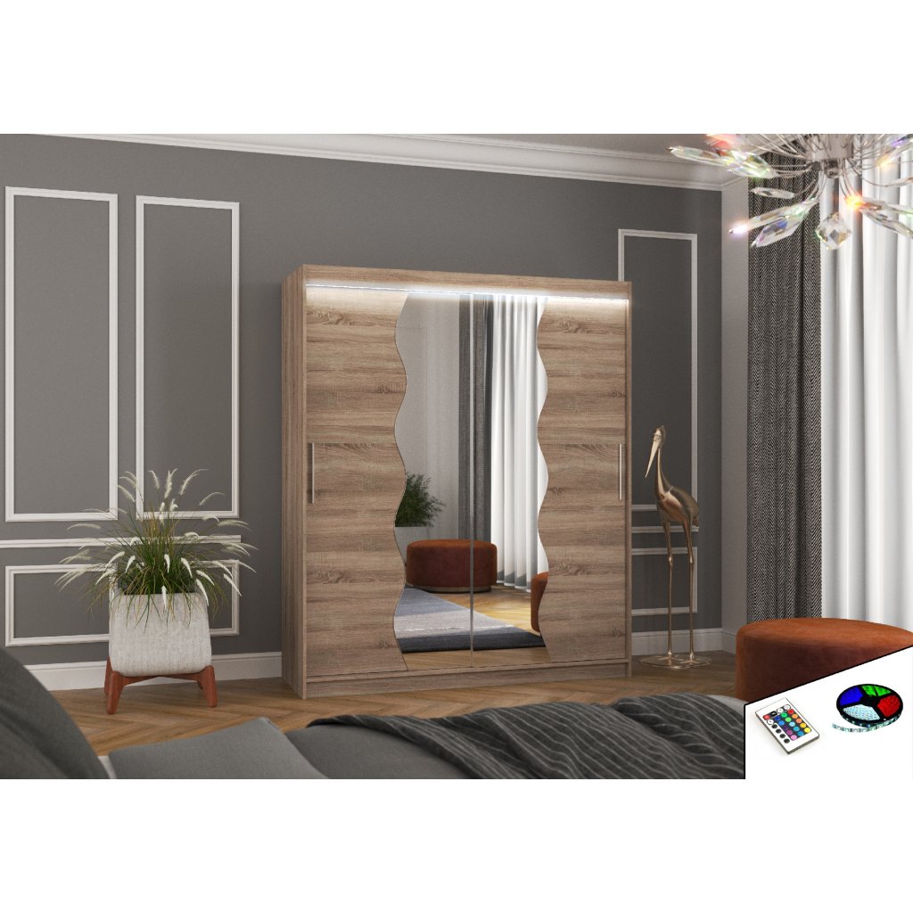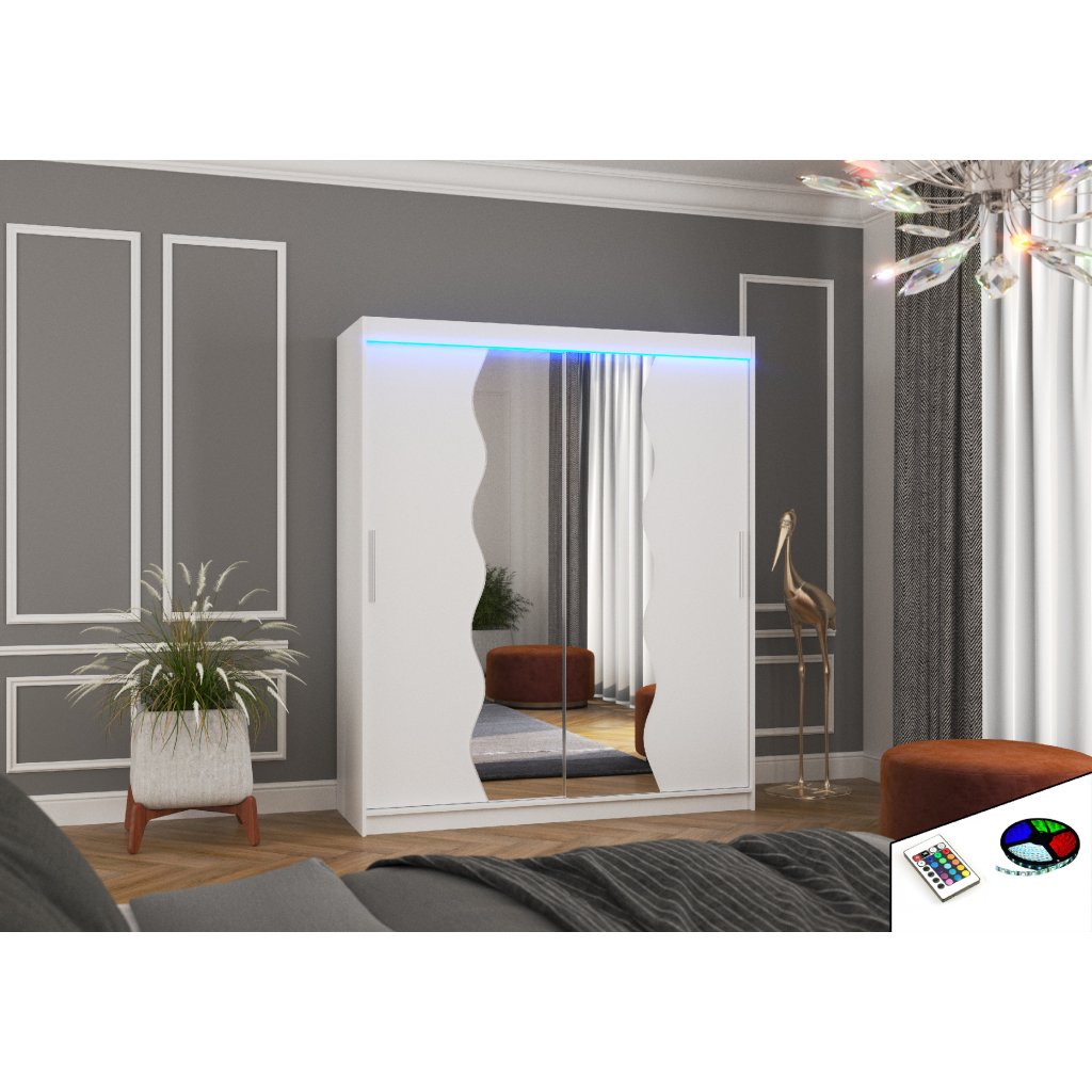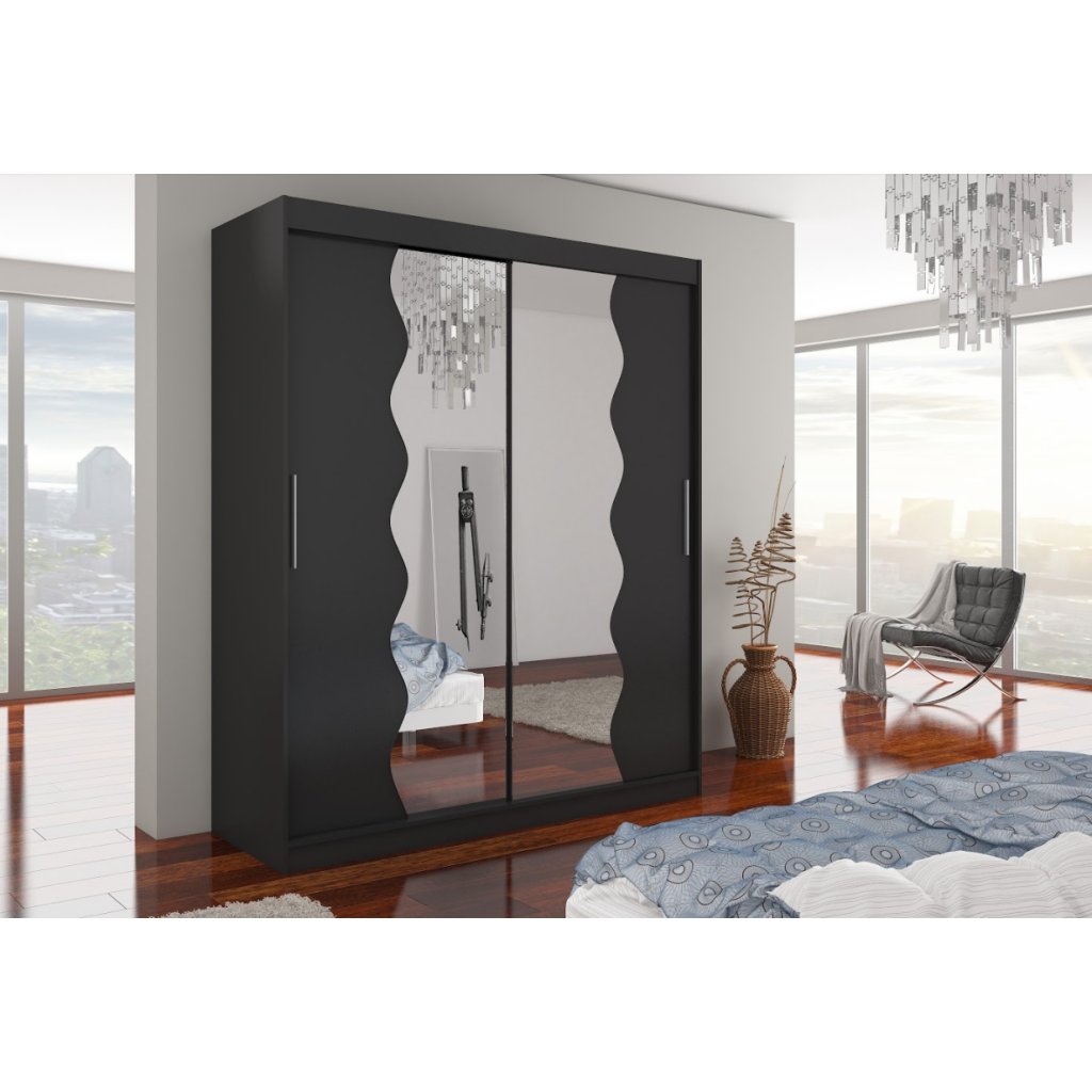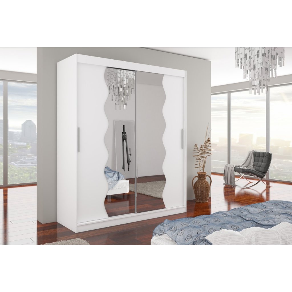 A KANSAS gardróbszekrény kiváló minőségű és masszív anyagokból készült. Az alumínium sínek megkönnyítik a mindennapi használatot . Tisztítása egyszerű és könnyű. A tükör egyik oldalán hullám alakúra van faragva, ami stílusos és egyedi megjelenést kölcsönöz a gardróbszekrénynek.