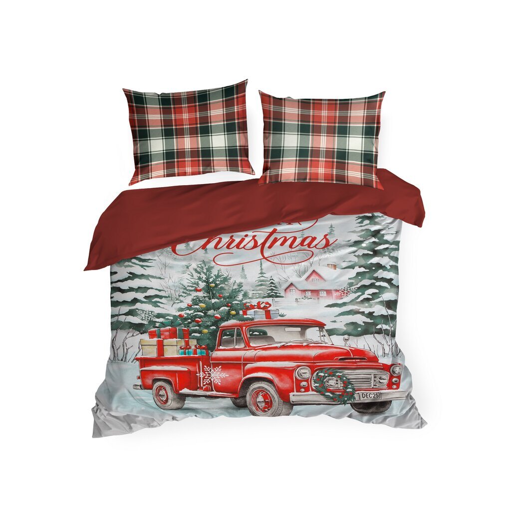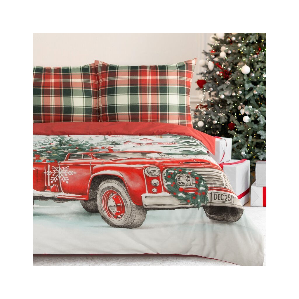Pamut ágyneműgarnitúra karácsonyi mintával. Szélesség: 220 cm, Hosszúság: 200 cm, Szín: Piros, Súly: 105 GSM, Összetétel: Anyag: 100% pamut, A csomag tartalma: 1 db 220 x 200 cm, 2 db 70 x 80 cm