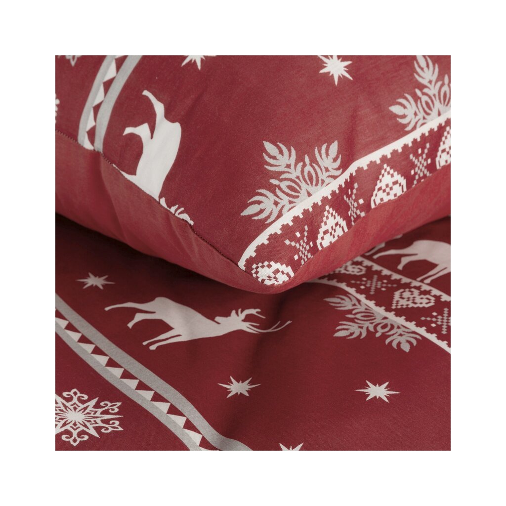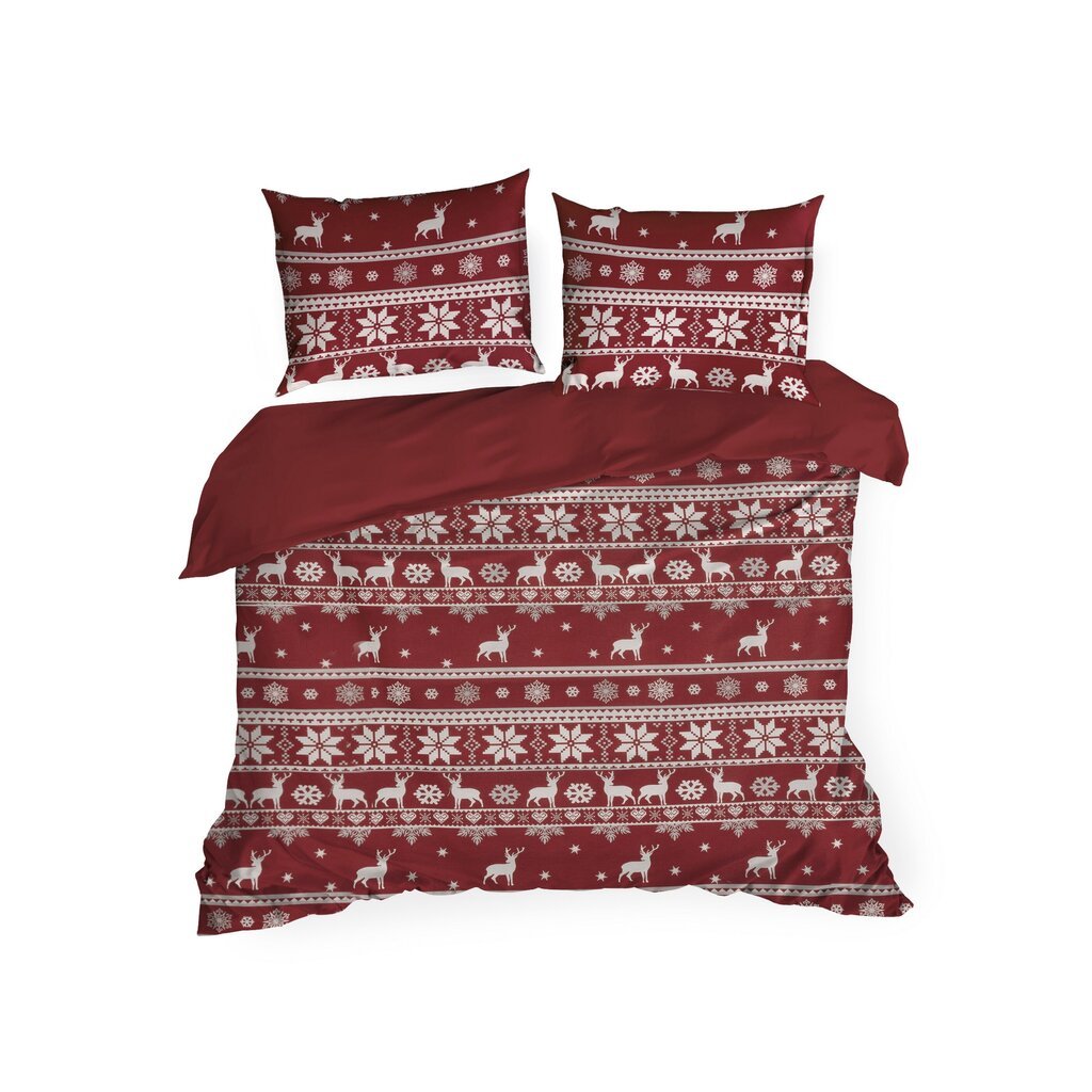 Pamut ágyneműgarnitúra karácsonyi mintával. Szélesség: 220 cm, Hosszúság: 200 cm, Szín: Piros, Súly: 105 GSM, Összetétel: Anyag: 100% pamut, A csomag tartalma: 1 db 220 x 200 cm, 2 db 70 x 80 cm