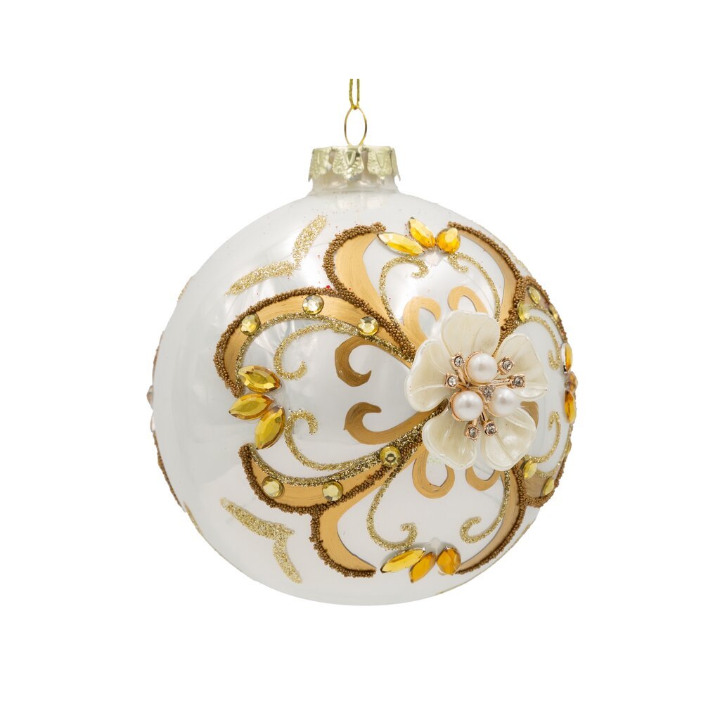 Üveg dísz, gyöngyökkel és kristályokkal díszítve. Szín: fehér/arany, Összetétel: 100% üveg. Az ár 1 darabra vonatkozik. Minimum rendelési mennyiség 4 darab. Csak 4 darab többszöröse rendelhető. Pl. 4, 8, 12 stb.