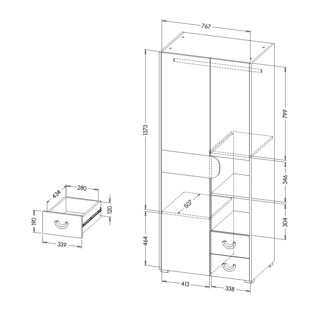 A Karino CA1 ruhásszekrény egy modern, kombinált dizájnú bútordarab . Két nagy, fehér ajtóval rendelkezik, fa díszítőelemmel. A jobb oldalon nyitott polcok és két, ugyanilyen fa díszítésű fiók található, modern fogantyúkkal. A ruhásszekrény oldalai és belső polcai sötétszürke színűek, ami elegáns kontrasztot ad az összképhez. A ruhásszekrény stílusos és praktikus, így gyerek- vagy diákszobába is alkalmas.