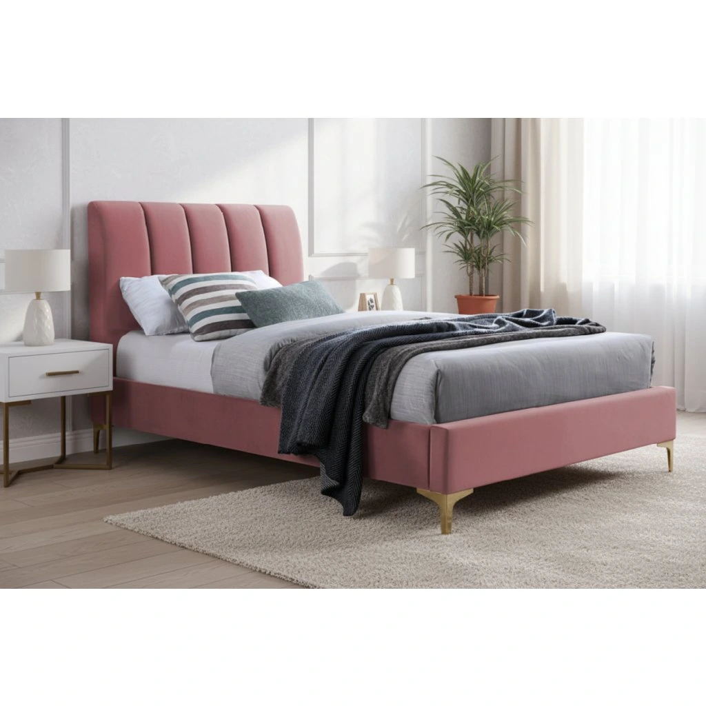 A rózsaszín Mirage Velvet kárpitozott ágy kiváló minőségű anyagból készült, amely a fém lábakkal együtt modern dizájnt és tökéletes megjelenést kölcsönöz az ágynak. A masszív steppelt hátlap megvéd a hideg falaktól, ugyanakkor elegáns megjelenésű. A bútort szétszerelve szállítjuk.