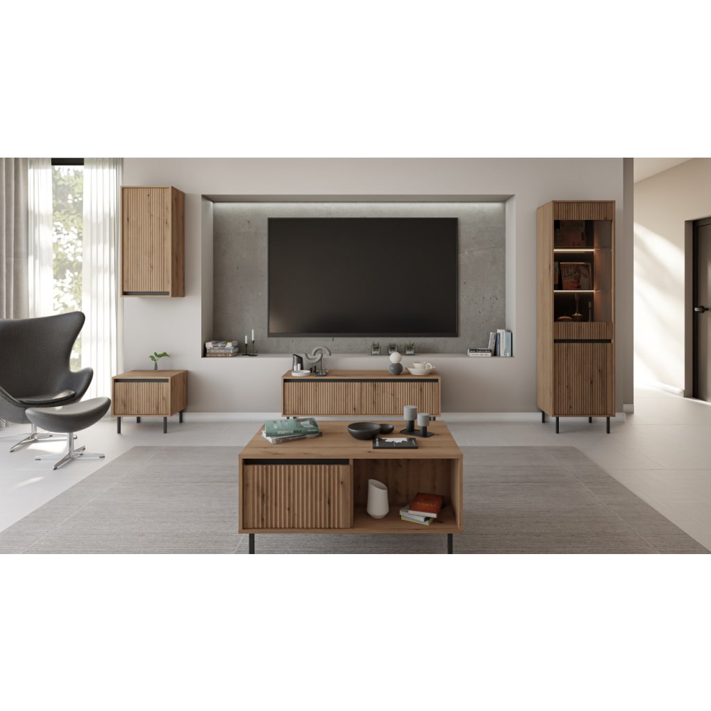 A KASOA 2F/101 vitrin minimalista formájával tűnik ki, amelyet a következők gazdagítanak: precízen megmunkált részletek , amelyek a japán esztétika egy teljesen új dimenzióját hozzák a belső térbe. A színpaletta lágy, földszínű tónusokra van hangolva , mint például a tölgyfa, kiegészítve fekete díszítésekkel, amelyek... Elegáns kontrasztot alkotnak a világos árnyalatokkal. Az egyszerű fekete fém lábak könnyedséget és vizuális légiességet kölcsönöznek a bútornak anélkül, hogy nehéznek tűnne. A vitrin két ajtóval, két üveg- és egy fapolccal rendelkezik.