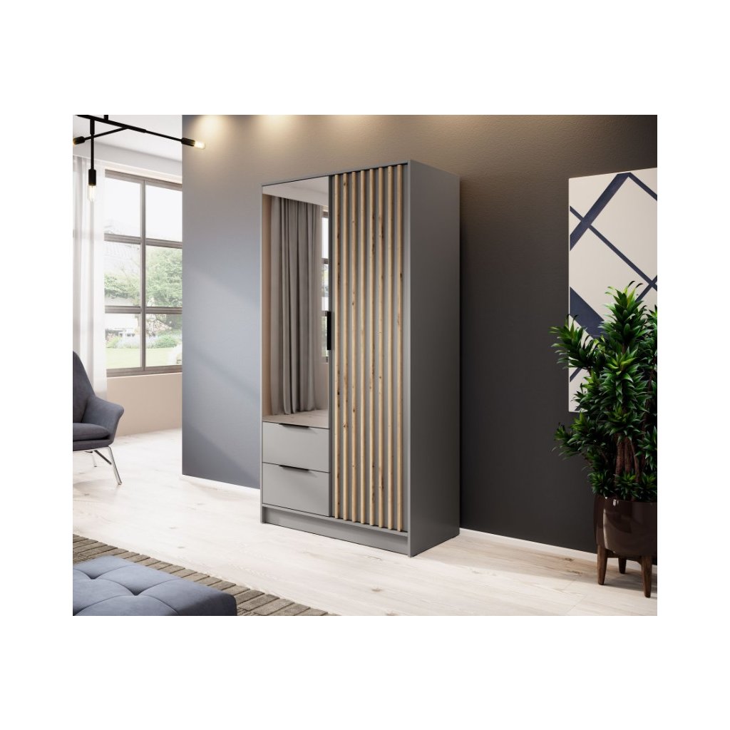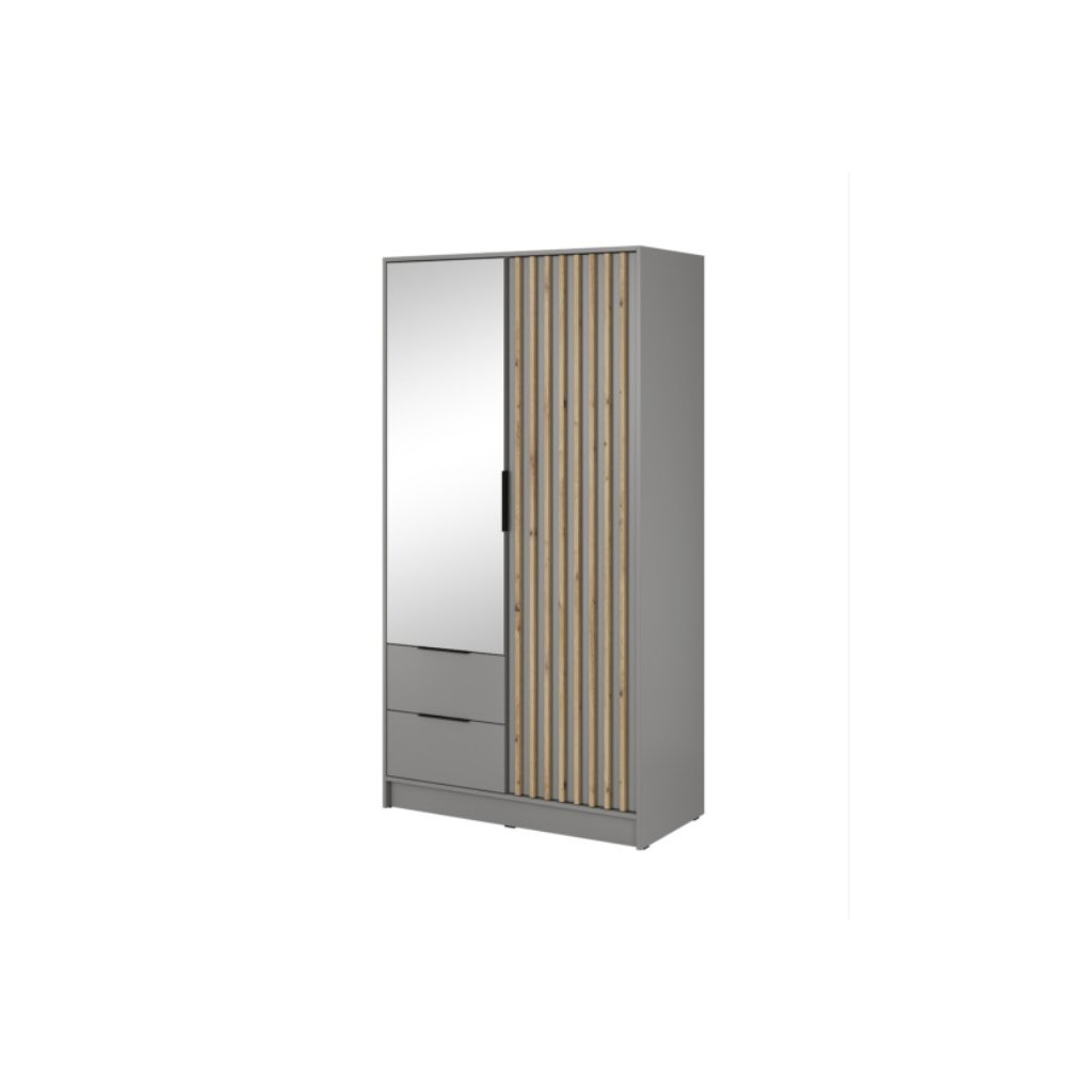 A függőleges lécekkel ellátott jellegzetes dizájn mélységet és vizuális érdekességet kölcsönöz bármely térnek. A modern és praktikus KELLY gardróbszekrények tökéletesen megtervezettek, mind praktikusság, mind megjelenés szempontjából. Az érdekes színkombinációknak köszönhetően zökkenőmentesen illeszkednek bármilyen modern enteriőrbe. A KELLY 2D gardróbszekrény két ajtóval és két fiókkal rendelkezik, a tükör pedig optikailag megnöveli a szobát. Univerzális kialakításuknak és praktikus tulajdonságaiknak köszönhetően a léces gardróbszekrények évekig népszerű kiegészítői lesznek otthonának.