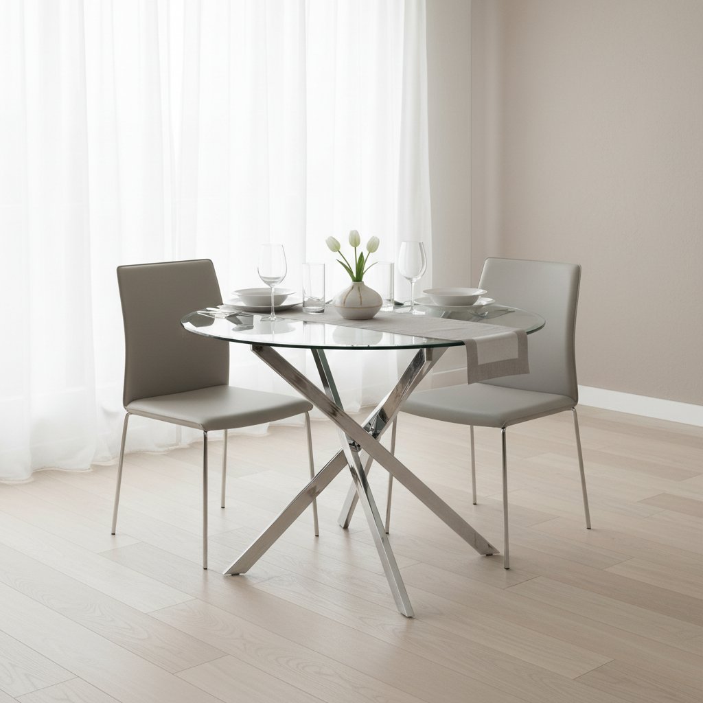 A modern, kerek üveg étkezőasztal, az AGIS kemény üvegből készült, nagyon ízléses és praktikus, így étkezője vagy konyhája domináns darabja lesz. A dizájn kerek formájának köszönhetően érdekes. Az asztal kerek teteje átlátszó edzett üvegből készült. Az eleganciát a krómozott fém lábak adják modern dizájnban. Az asztal négy személy számára alkalmas. Az asztal magassága 73 cm, átmérője 90 cm.
